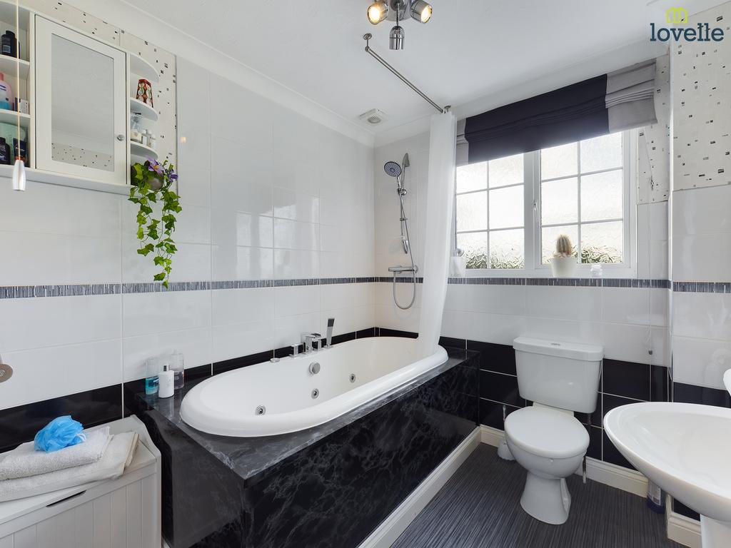 Fully tiled with jacuzzi style bath and shower, wash hand basin, low level WC, extractor fan and window to the rear aspect.