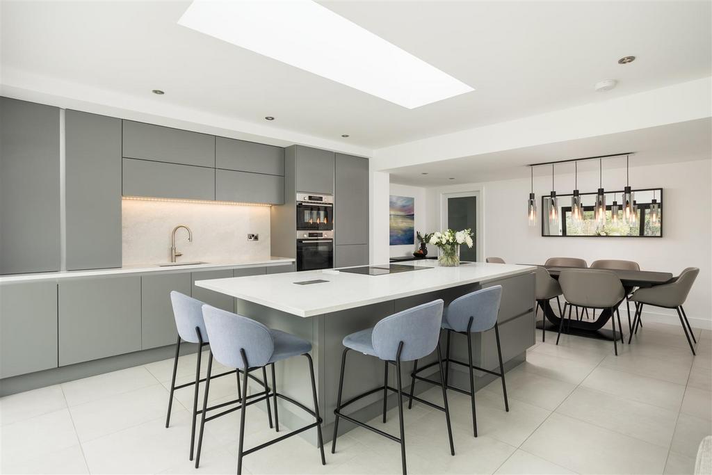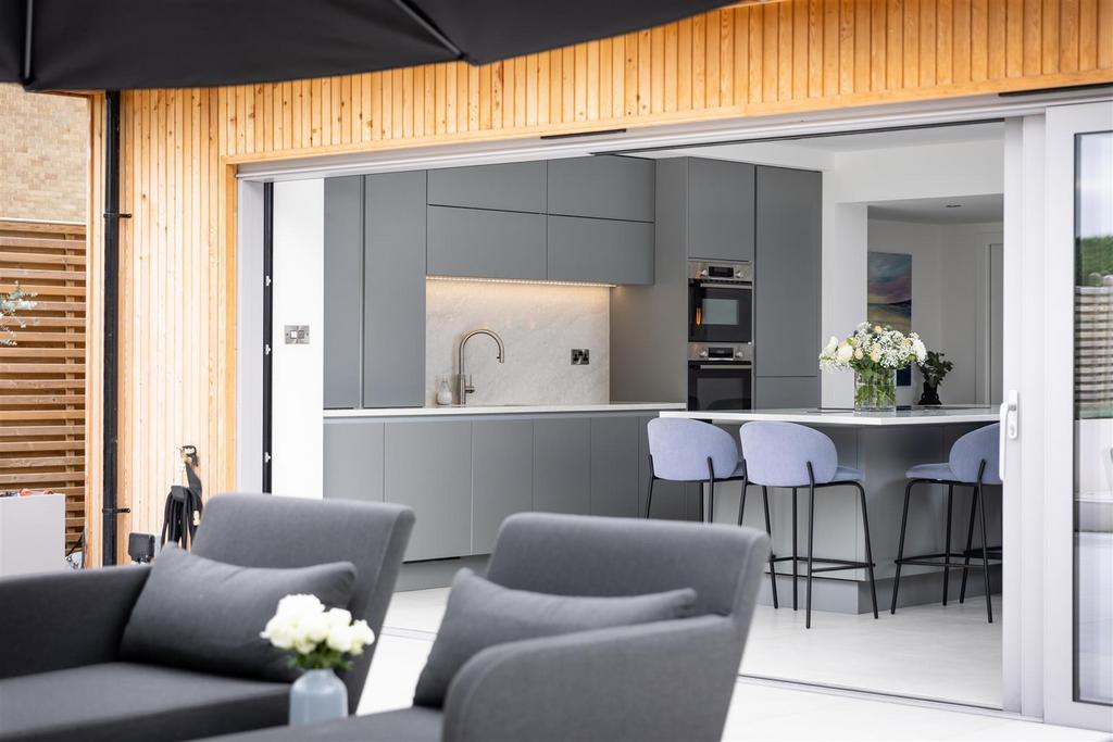 A feature glass door leads through into the remarkable living kitchen which must be viewed first hand to be truly appreciated. Essentially three rooms in one, this open plan living space has well defined kitchen, dining and sitting areas with full length sliding glass doors to the rear elevation allowing light to flood the room. The kitchen area has a combination of base and wall storage units with a substantial central island and quartz preparation surfaces. There are a range of integrated appliances including a Quooker tap over a 1 1/2 sink with drying area, Bosch oven and combination oven, Miele induction hob, Bosch dishwasher and fridge/freezer. There is ample room for a freestanding dining table and a more relaxed sitting area with a modern electric fire acting as a focal point.