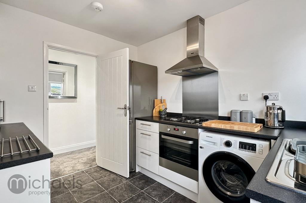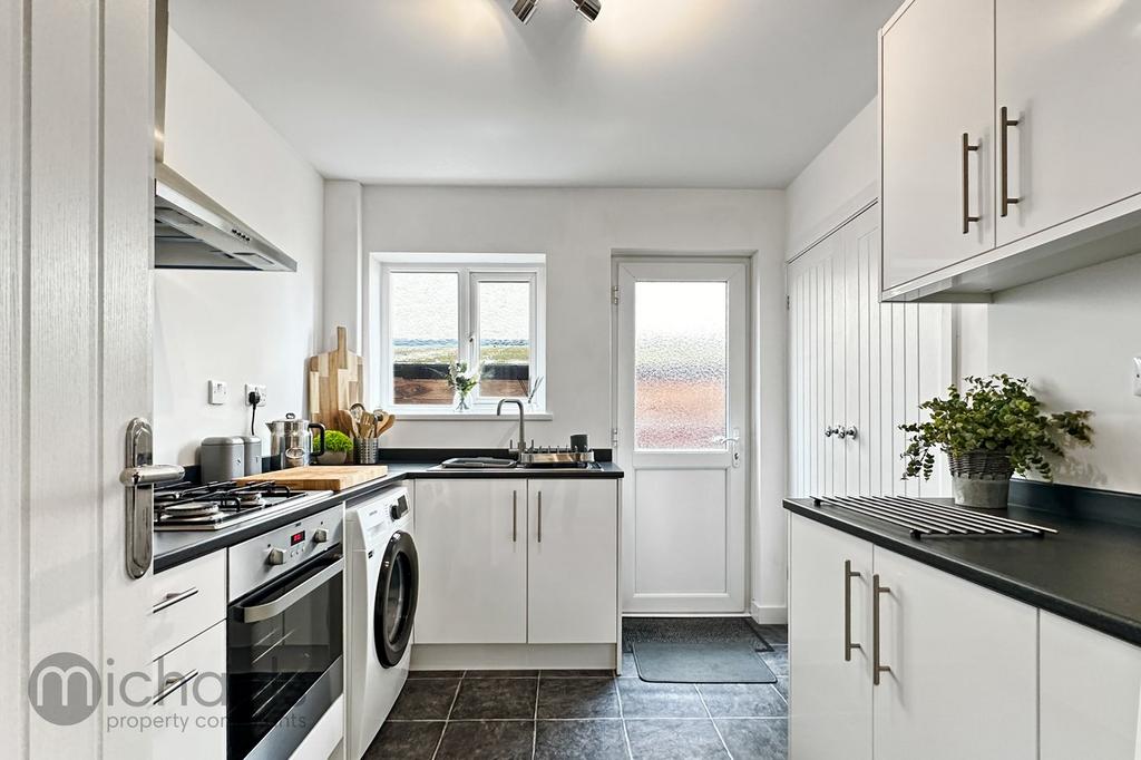 10' 6" x 8' 2" (3.20m x 2.49m) Double glazed window and door to side, range of base and eye level units with work surface over, inset sink unit with mixer tap, integrated cooker with hob and extractor over, space for washing machine, larder cupboard housing boiler.