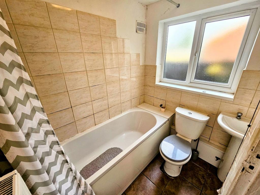 Opaque double glazed window to side. White suite with mixer shower over bath. Wash hand basin and low level wc, radiator, part tiled walls and ceramic flooring, extractor fan.