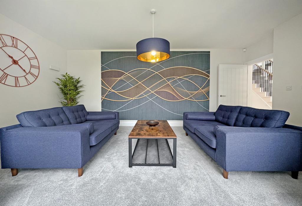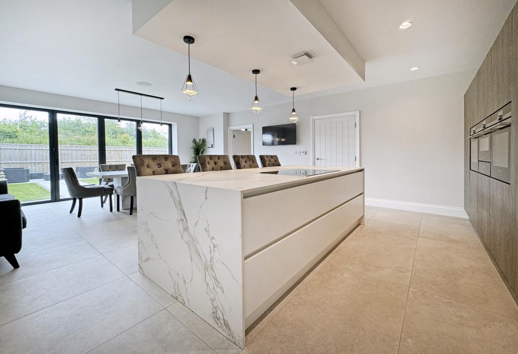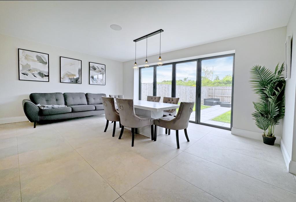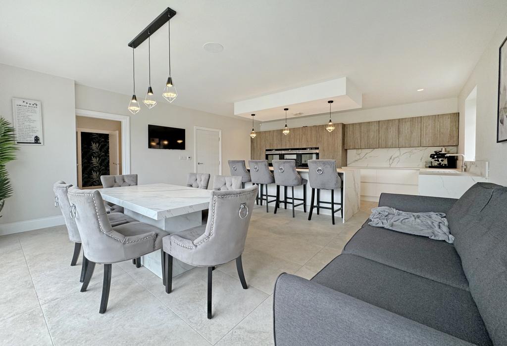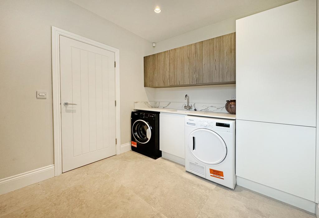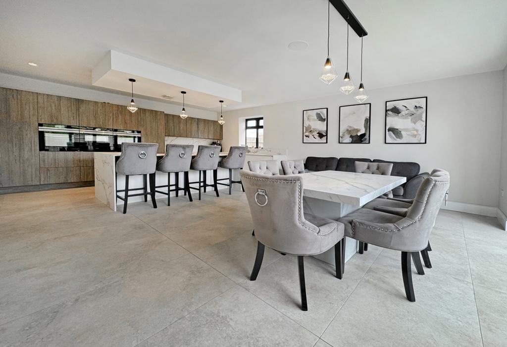 Accessed via a doorway to the left corner of the reception hallway, you’ll discover the true heart of this incredible home, a stunning open plan kitchen & dining room with pale grey oversized floor tiles, feature pendant lights and full width bifold doors connecting with the rear garden which is perfect for alfresco dining during the summer months. The kitchen is finished in a sleek minimalistic style with handle free units with a mix of white gloss and full height wood finish. A large feature island takes centre stage with wrap around Dekton worktop, recessed induction hob, discreet extractor and breakfast bar overhang hosting 4 bar stools. The kitchen is benefits from an array of integrated appliances inclusive of Quooker instant boiling water tap, Siemens fridge freezer, dishwasher and double oven. A large dining room table flows across the room in front of the bifold doors, creating a real social hub. The kitchen is complimented by a separate utility & laundry room, adjacent to the dining area. The utility provides access to the garden via rear door and enjoys a guest washroom.