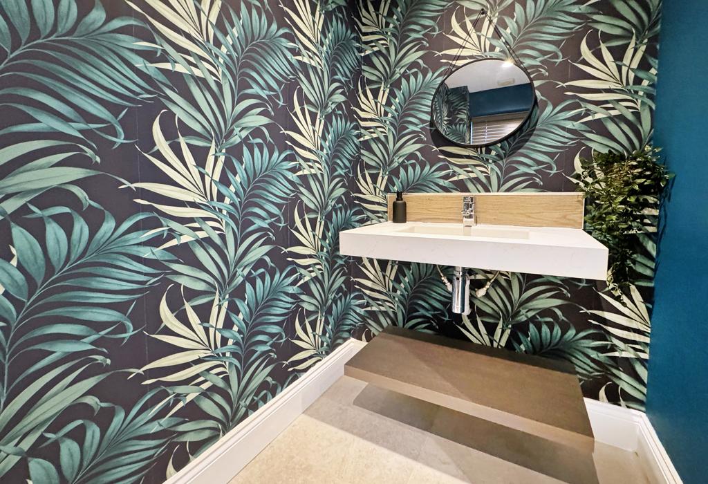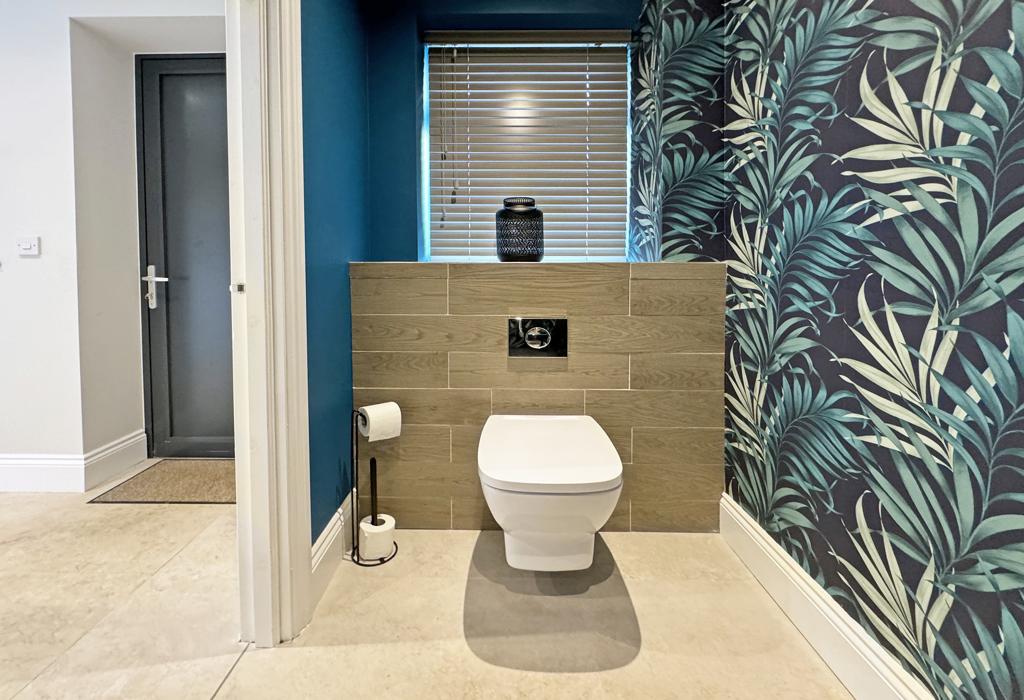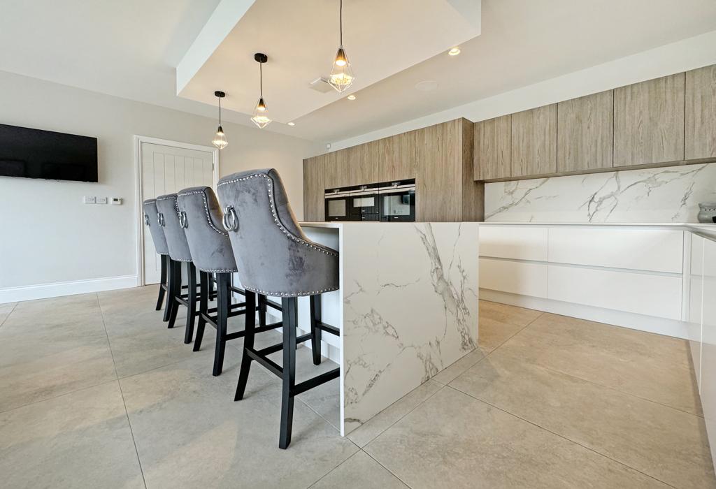 Adjacent to the gym, off the hallway, double doors lead you through to a large cinema room & snug, with a lovely media wall spanning the full right-hand wall, complete with illuminated recesses, landscape electric feature fire with a space for an 85” TV above. A doorway to the left corner flows through to a home bar & garden room with bifold doors opening out onto the rear patio. Soft grey carpet from the cinema room switches to a vinyl herringbone floor as you enter the bar. The perfect combination to unwind with family on an evening or entertain guests.