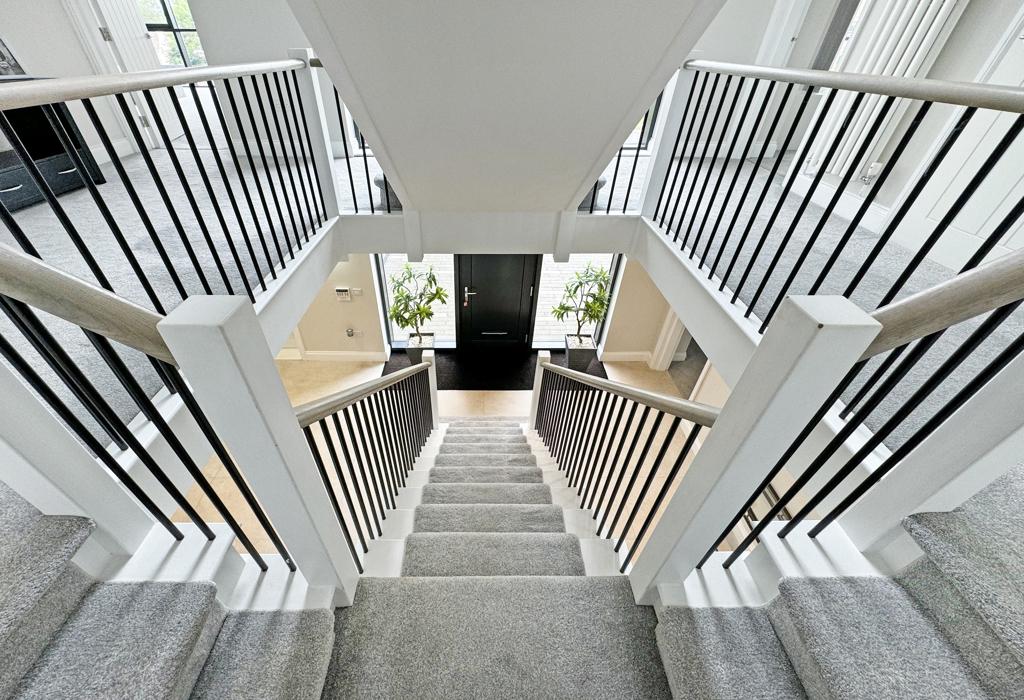 The modern grand main entrance welcomes you and your guests with a full height glazed façade spanning all three floors with grey aluminium frames, inclusive of the roof, flooding the staircase with beautiful natural light across every level. The glazed entrance creates a real wow factor and sets the tone for the rest of this impressive family home.