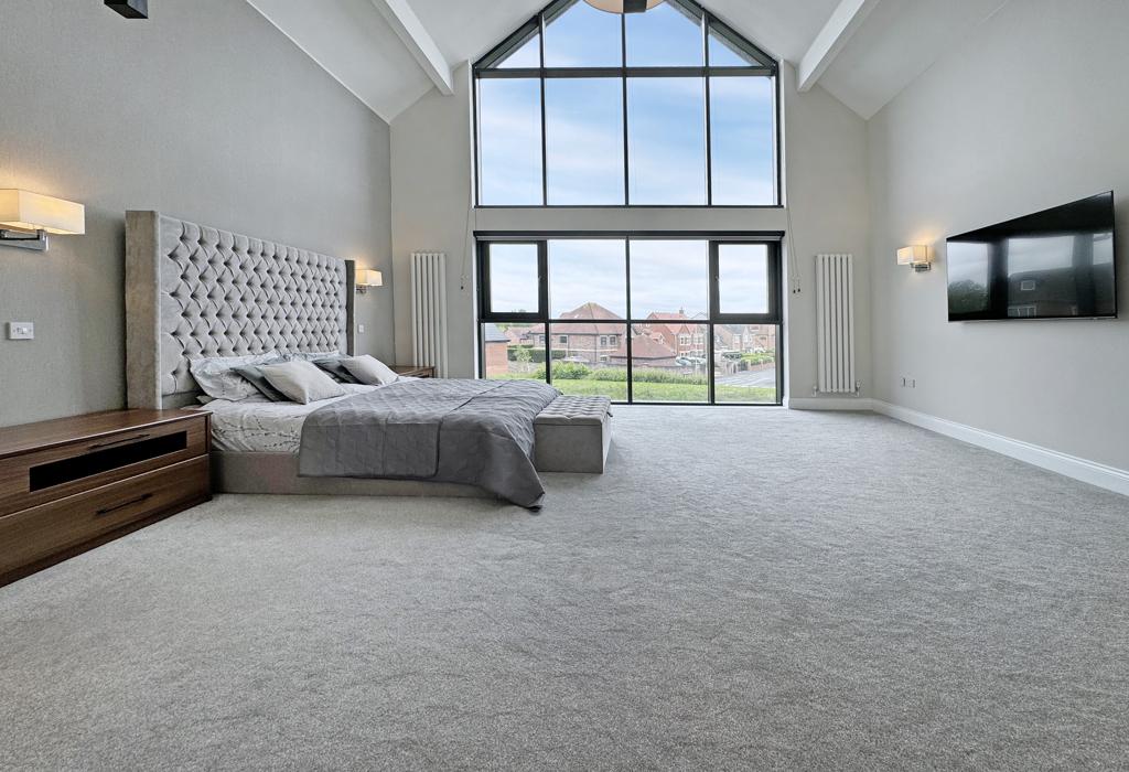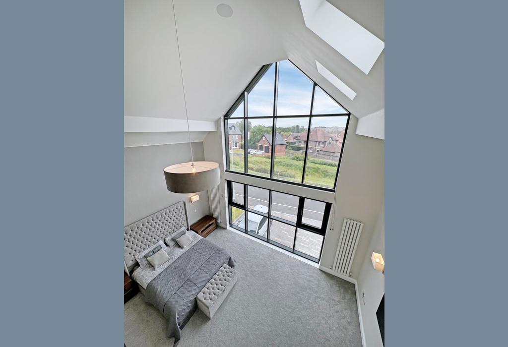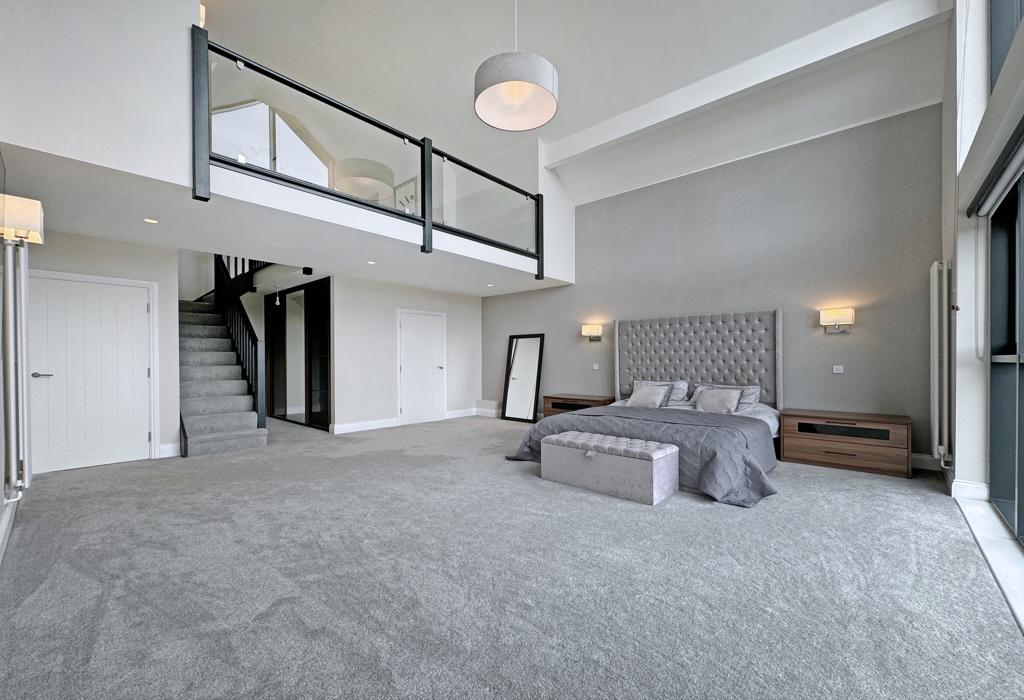 The Master Bedroom is an indulgent suite with a generously sized 29ft suite complete with walk-in dressing room, ensuite bathroom, mezzanine lounge and full height glazed feature wall with dramatic vaulted ceiling. The ensuite bathroom is finished in a modern monochrome style with pale grey ceramic tiles, oversized walk-n shower with glazed partition and black rainfall shower, wall-hung landscape sink with black framed vanity unit and minimalist toilet.