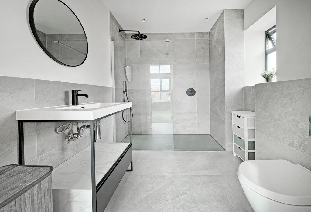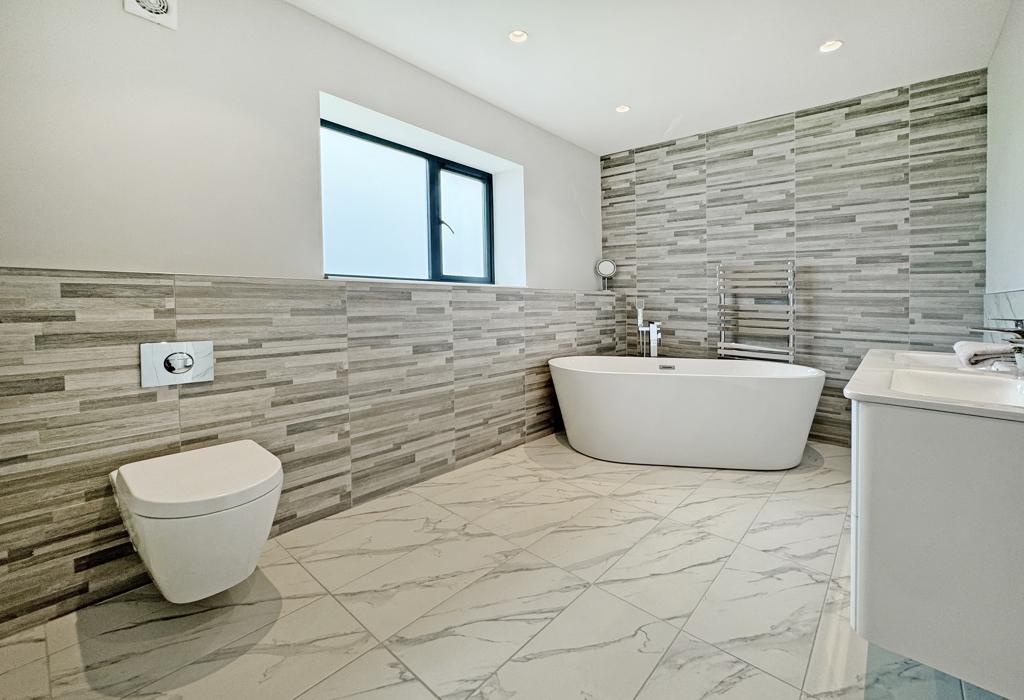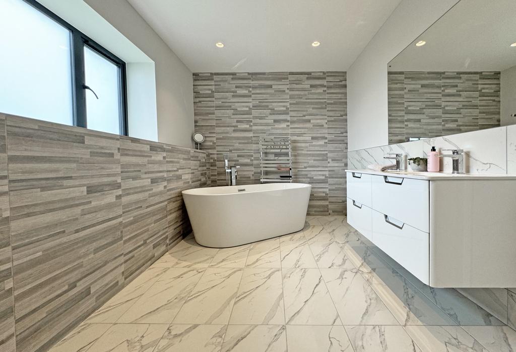 Completing the first floor is a spacious and well-proportioned family bathroom natural toned tiling around the walls with white and grey marble effect tiles adorning the floor. The bathroom enjoys a modern white suite inclusive of a floating wall-mounted toilet with push button flush, dual wall-mounted sink with white gloss vanity unit and a stunning freestanding bath with floor mounted taps with microphone shower head.