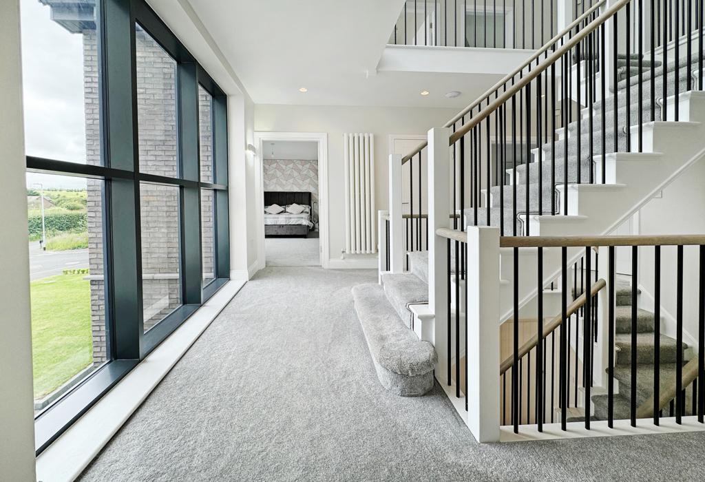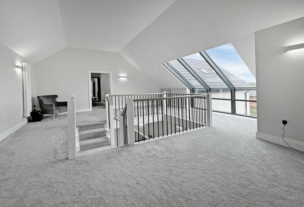 The central staircase continues up to a second-floor gallery balcony and landing with a full glass wall to the front aspect offering incredible views over the golf course and sea beyond. The second floor plays host to a further 3 large double bedrooms. The bedroom to the right is setup as a bedroom with fitted sliding wardrobes, vaulted ceilings and two skylight windows.