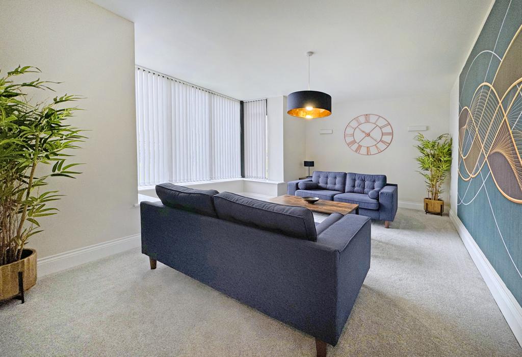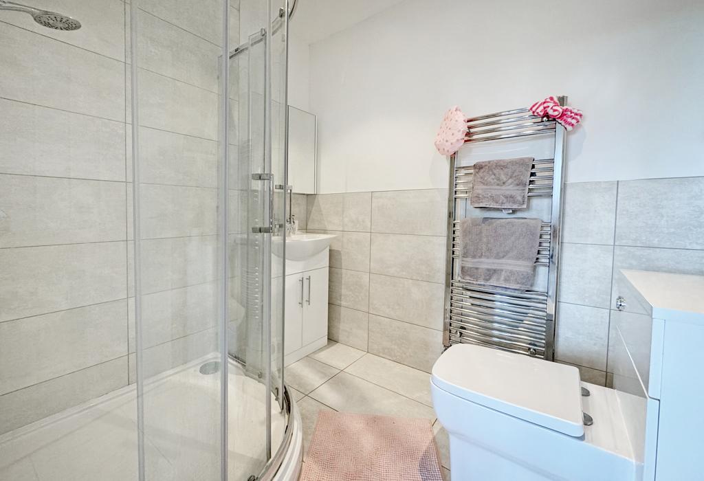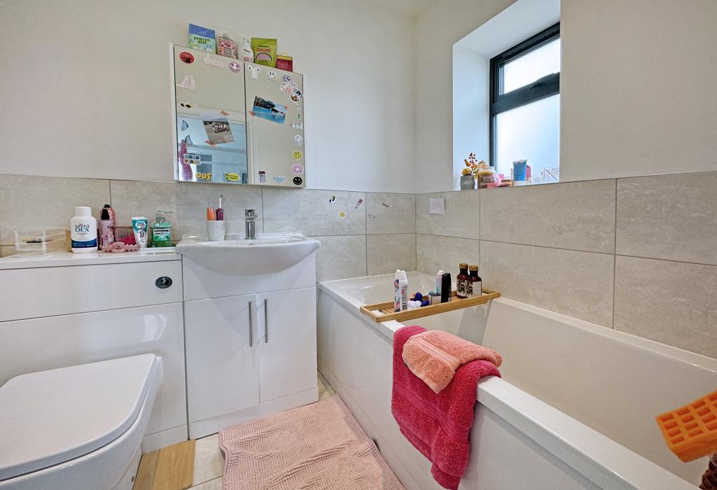 Bedroom two is located to the rear aspect and benefits from integrated LED ceiling lights, built-in wardrobes, pale grey carpet and an ensuite bathroom. The ensuite features a bath, vanity sink and toilet.