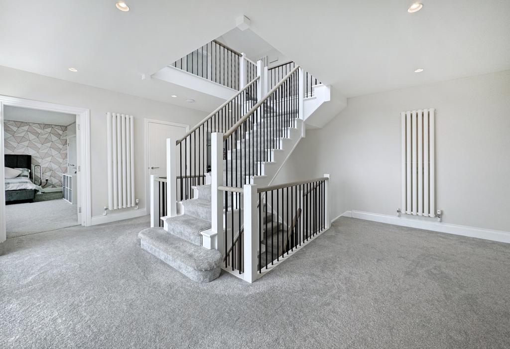 As you enter the property, you’re welcomed into a spacious reception hallway with lovely natural toned tiles flowing underfoot and white central bifurcated Lowe & Simpson staircase with powder coated stainless steel spindles, tactile oak balustrades and grey carpet. The reception hallway directly services the majority of ground floor spaces and is complimented by a boot & cloak room, which also houses the boiler. Underfloor heating flows throughout the ground floor, with the exception of the gym/garage.