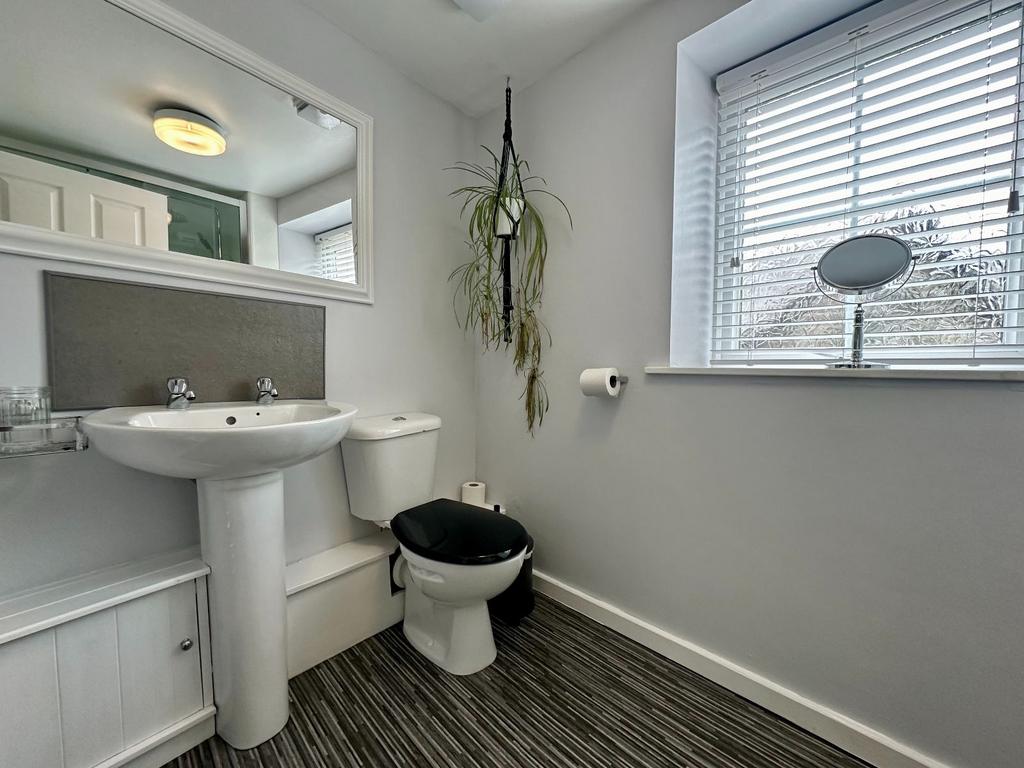 Window to rear, extractor fan, shower cubicle with wet wall panelling and mains shower, pedestal hand wash basin, low level WC, heated towel rail/radiator, cushion flooring.