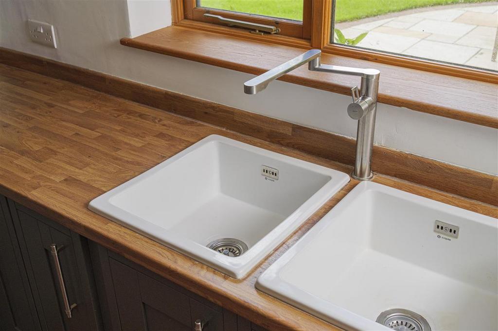 The kitchen and dining room have tiled flooring, exposed panelling and a beam which divides the dining area to the kitchen with a breakfast bar between the two spaces. There is an array of wall and floor units, finished with Iroko wood work tops, many appliances are integrated and double ceramic sinks overlook the garden. The space is further enhanced by a vaulted utility room, which is adjacent to the kitchen and has an inner hallway leading to a shower room, with a stable door providing access to the rear garden.