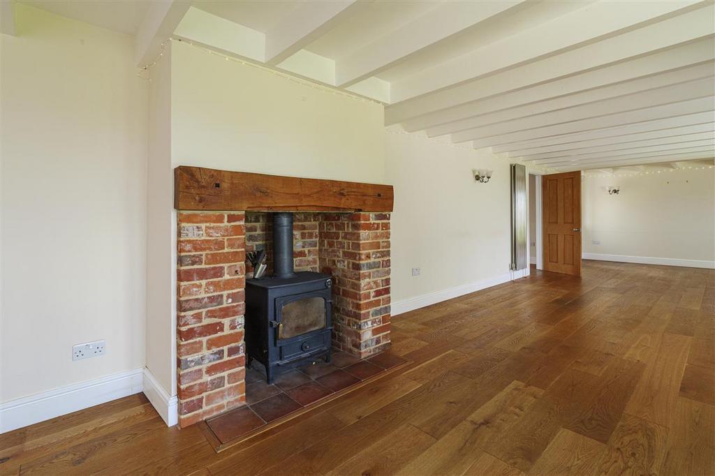 To the left there is a vast family living room which forms part of the extension and has a set of oak French doors and arched bi-folds leading to the garden terrace. The ceiling exposes the rafters which creates another depth of character whilst the wood burning stove is nestled with exposed brick and a handsome bressummer.