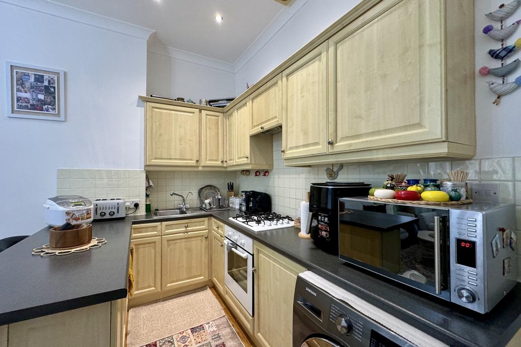 4.16m(13ft8) x 3.80m(12ft5). Double glazed bay window to front, range of eye level and base units, stainless steel sink with mixer tap and drainer, built in oven, hob and extractor fan, built in fridge, space for appliances, part tiled walls.