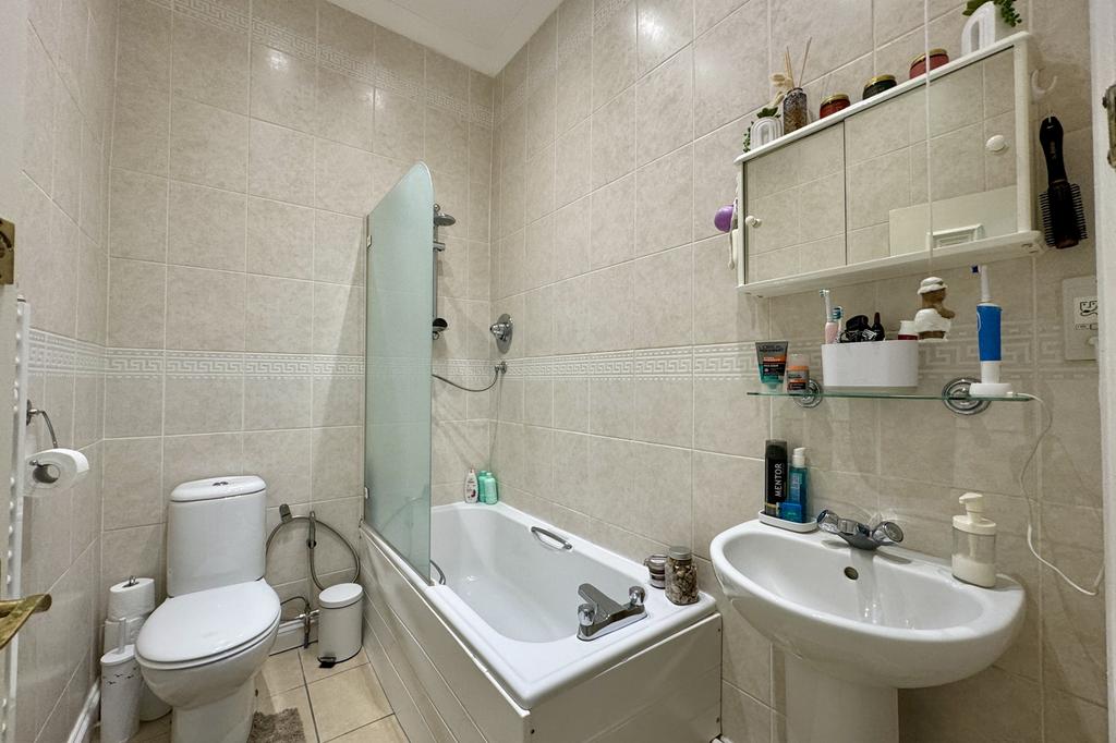 White suite comprising low level w.c, pedestal wash basin with mixer tap, panelled bath with centre mixer tap, shower fitted above bath, tiled walls, heated towel rail.