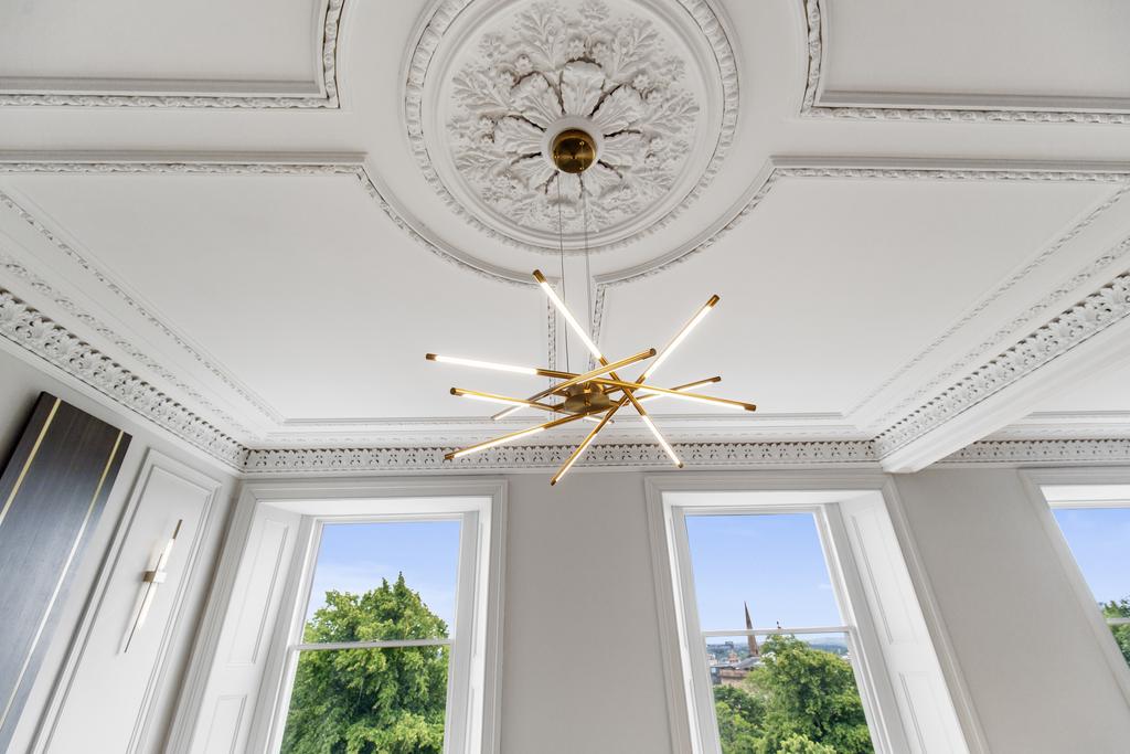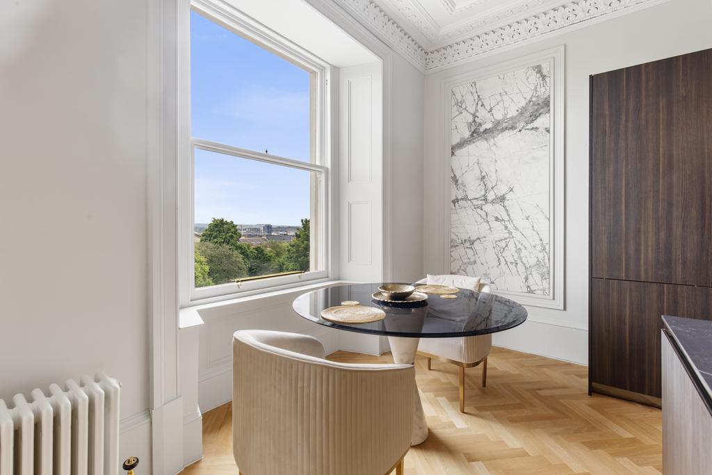Welcome to Claremont Terrace, an exquisite example of modern refurbishment and timeless elegance, nestled in the heart of Glasgow's prestigious West End. This stunning 2-bedroom, 1-bathroom, and 1-shower room apartment spans an impressive 1297 sqft, offering a luxurious urban living experience. Step inside to be greeted by a spacious and light-filled living area, where high ceilings and Roman-inspired finishes create an atmosphere of sophistication and charm. The lounge is a masterpiece of design, featuring carefully chosen furnishings and decor that blend comfort with style, making it the perfect setting for both intimate relaxation and entertaining guests.