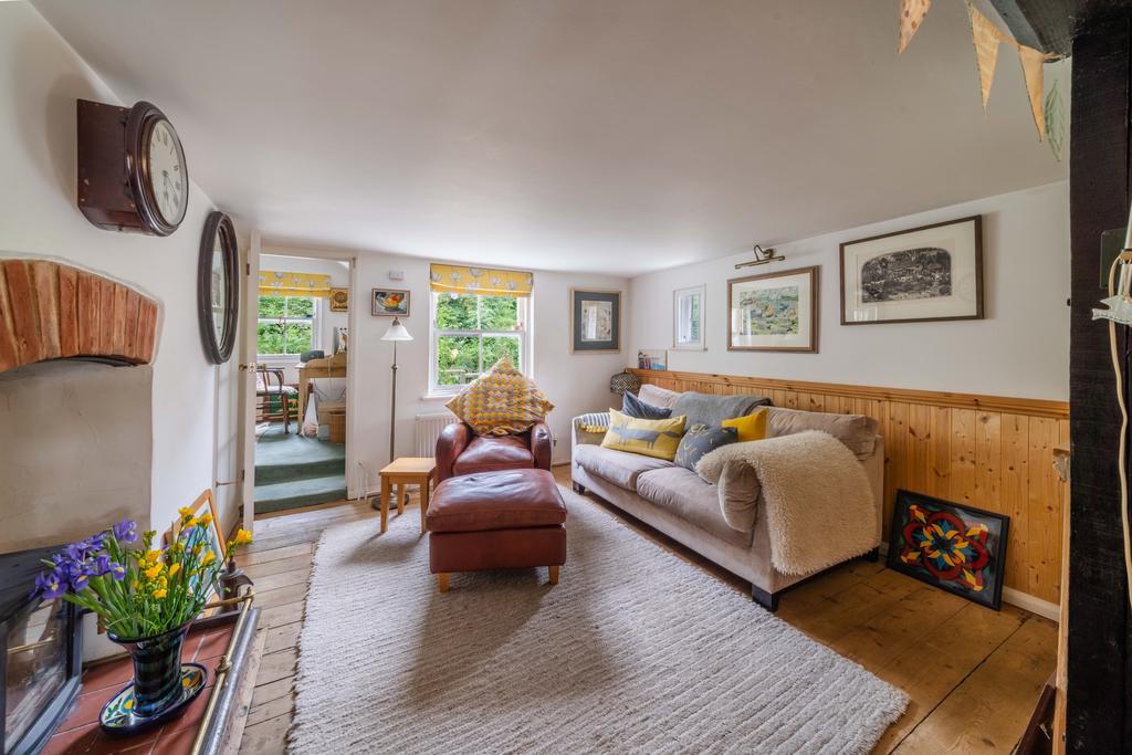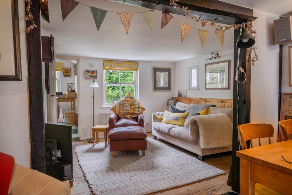 Striped floor boards radiator, wood burner, double glazed sash window to front aspect, stairs to first floor.