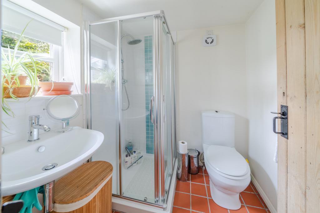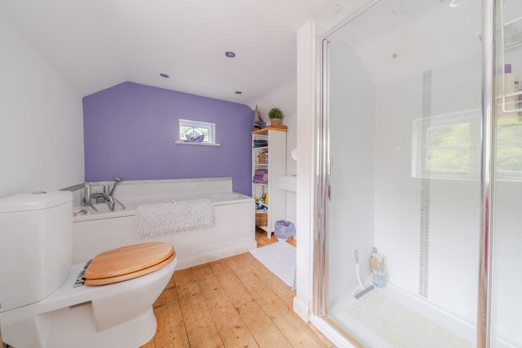 Panelled bath, low level WC, pedestal wash basin, walk in shower cubicle, stripped floor, radiator, double glazed window to side aspect, insert spot lights.
