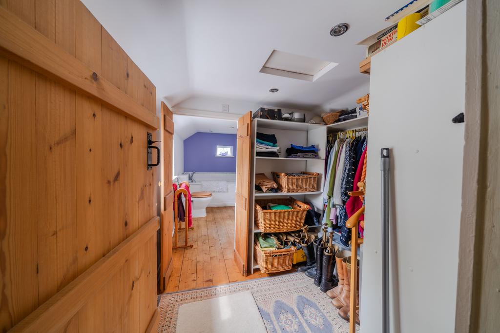 Walk in dressing room 2.19m x 1.86m with shelves and hanging rails, double glazed window to side aspect.
