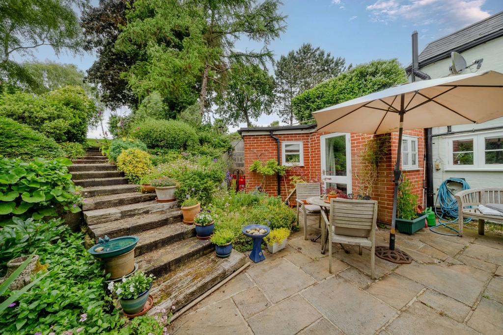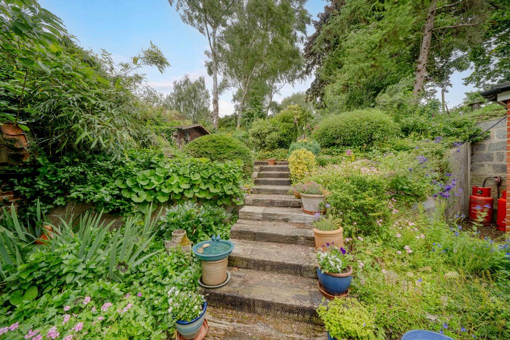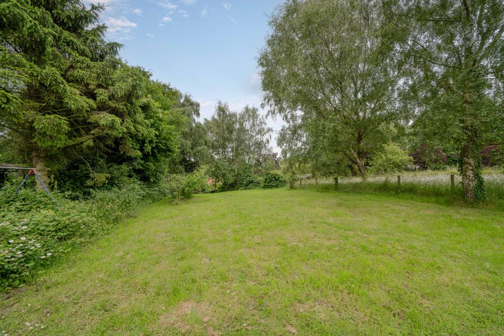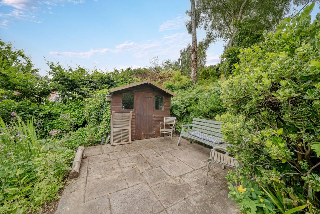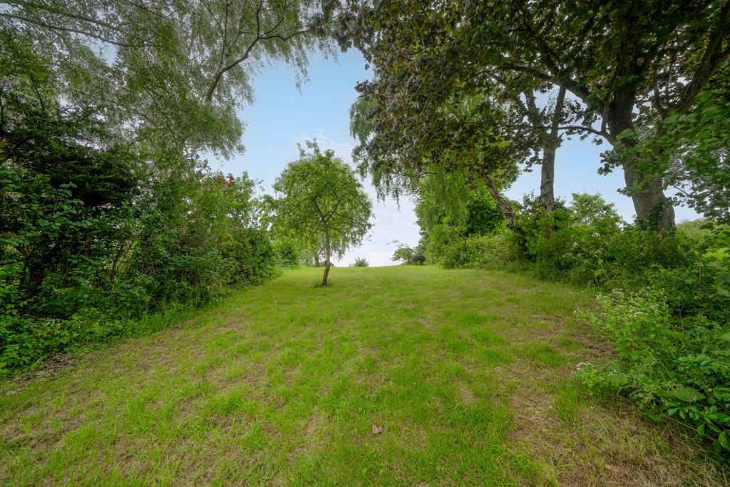 The front of the house has a small front garden with a number of flowers and shrubs, with a driveway to the side and gates leading to rear garden with patio area and steps up to a further patio and garden shed. The bottom part of the garden has mature shrubs, established plants and trees. The top area of the garden is laid to lawn with fruit trees and backing onto open fields and views of Alton Water.
