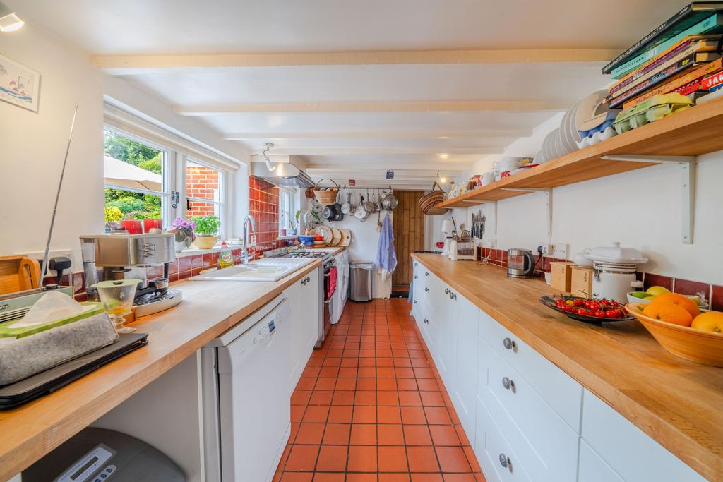 Range of cupboards, drawers and wall cupboards, one and a half butler style sink unit, oak work tops, space for dishwasher, space for washing machine, space for fridge, space for cooker, radiator, tiled floor, Water softener, double glazed window over looking rear garden.