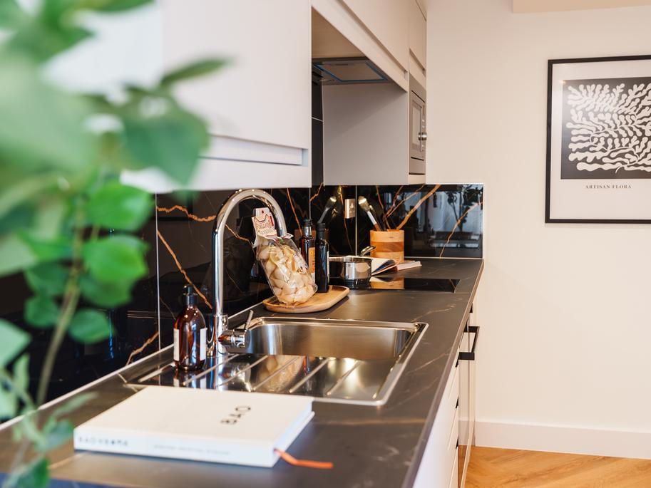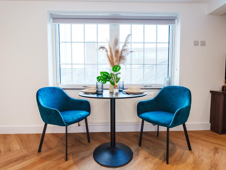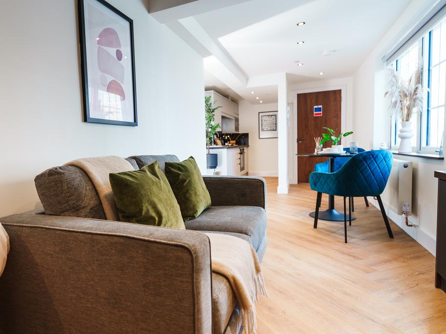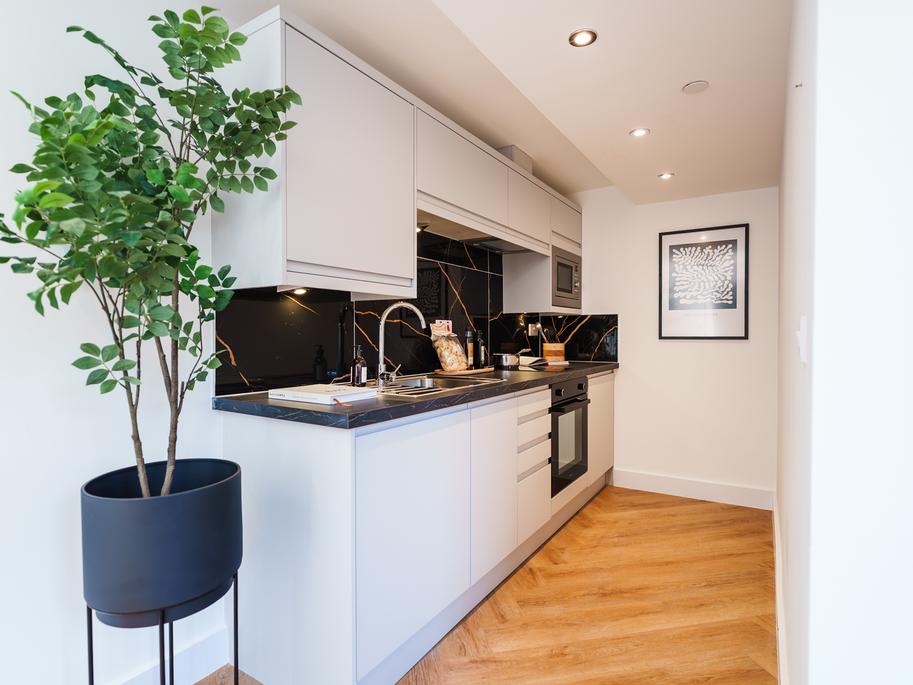 Natural light beams through the floor-to-ceiling windows, creating an airy and spacious living space. The open-plan kitchen and lounge are furnished with a 2-seater sofa, dining nook, study space and smart TV - with the kitchen’s high-spec appliances of oven, induction hob, fridge-freezer and washer-dryer, all integrated creating a seamless finish.