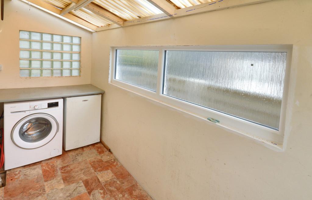 Lean-To Utility Room A useful additional space with a roll-edge work surface and space under with plumbing for a washing machine, together with space at the side for an under-counter refrigerator. Double-glazed uPVC window to the side elevation, part-glazed (double-glazed) uPVC door to outside and there are two glass-brick panels for obscure glazed natural light. This room has a corrugated roof covering with a strip light to the supporting beams.