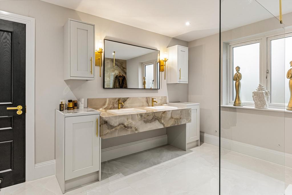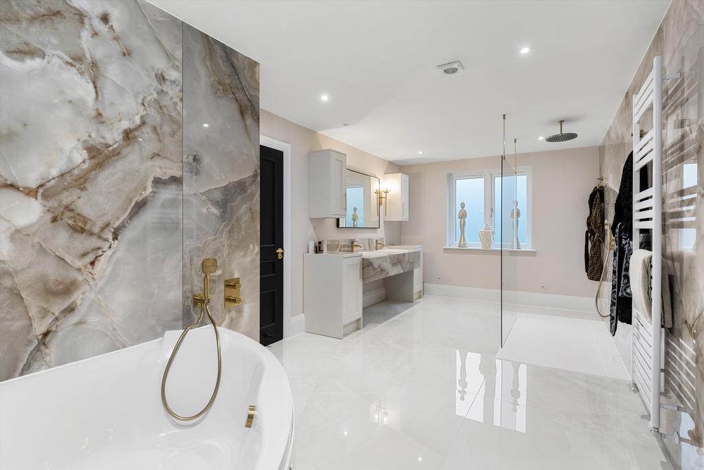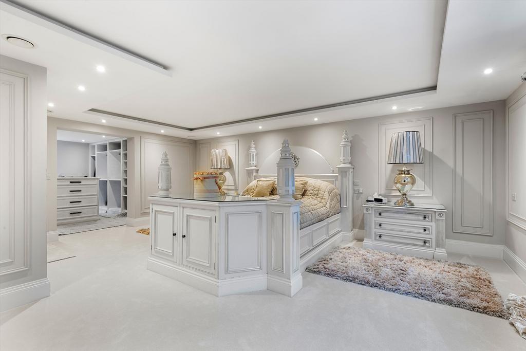 On the first floor there are five large bedroom suites, four of which are South-facing. The principle bedroom suite comes with a Clive Cristian super-king bed and bedside tables as well as a large dressing room leading onto an impressive bathroom with double sinks, walk in shower and corner bath finished off with large Italian format Onyx tiling. The high specification continues throughout with superior bathroom fittings and lighting installed across the entire floor.