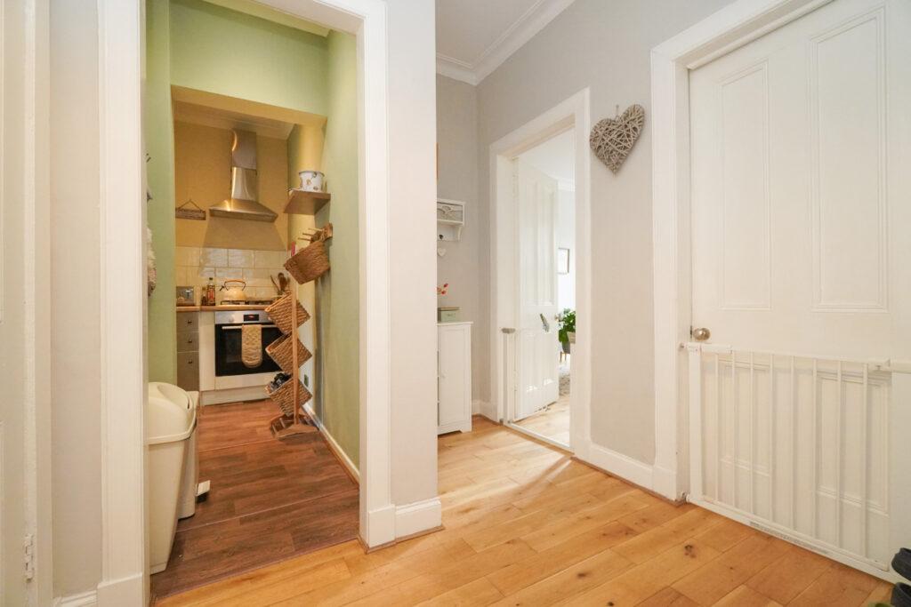 The impressive and spacious hallway provides access to all rooms. The bright lounge has a twin window formation to the front enjoying outlooks to the well tended community gardens. There is space for a variety of furniture and generous recess is the perfect spot for a study or snug. The L-shaped kitchen is a long galley style space with a variety of wall and floor units and a window to the rear. The main bedroom is exceptionally spacious and similar to the lounge there is a large recess and a twin window formation to the front. Bedroom 2 is a well proportioned room at the rear of the flat. The bathroom has been changed to a modern, tastefully presented wet room with a mains mixer shower and a white two-piece suite.