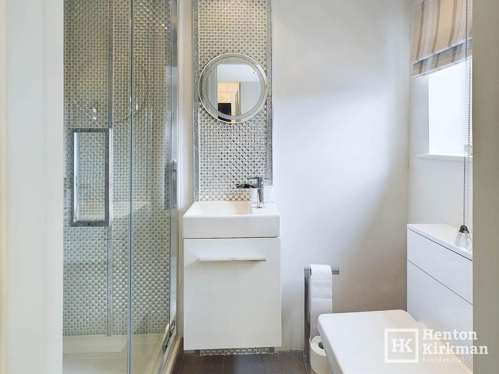 Fitted with a white suite and enjoying contrasting tiling to the floor and walls, there is a large walk-in shower cubicle with a low profile tray and Rainhead, a push button WC and wall mounted vanity basin with two drawers under.