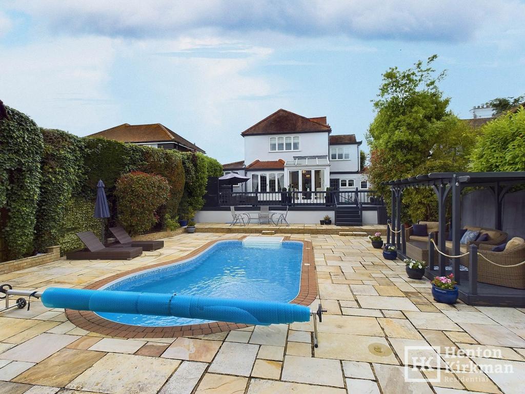 As you step outside, the entertainment space continues with a wraparound deck that leads to the south-facing garden, which is paved and incorporates a choice of lounging areas surrounding the central heated swimming pool.