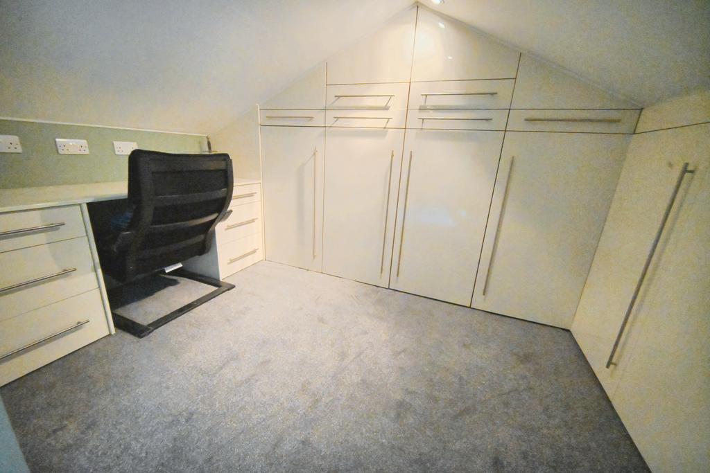 Hobbies Room/ Bedroom: 17’9” (5.40m) x 8’6” (2.60m) Full width feature wall with storage & media space, coved ceiling, recessed ceiling spotlights, Karndean flooring with underfloor heating and double glazed leaded window to front.