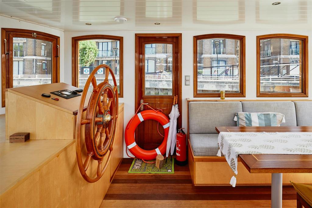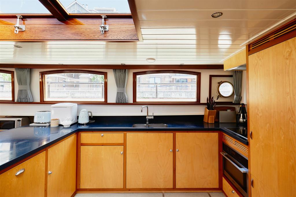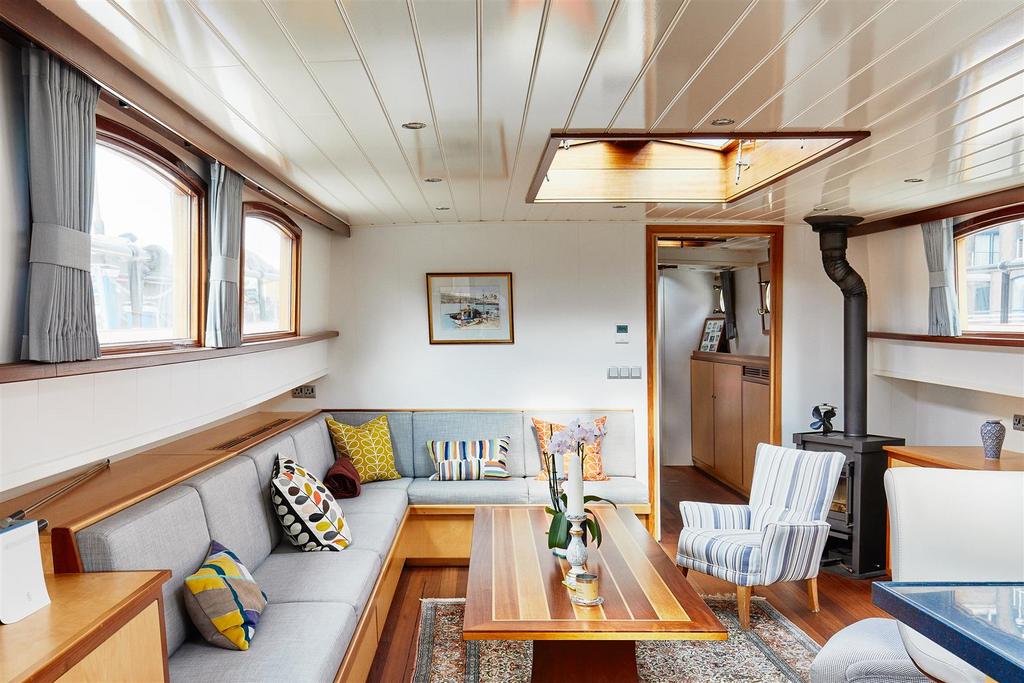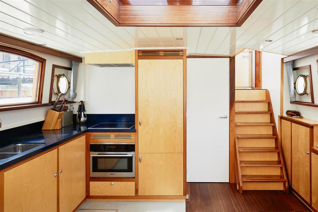 *VESSEL ONLY*. It was designed by Jan Visser, a Dutch marine architect and by the current owners. It was built by SRF in Harlingen, completed in September 2016 and sailed over the North Sea to its present mooring. It is designed with a Scandinavian influence and with no expense spared on the finish. It is a fine example of a fully functioning, luxury floating home, which is also quite capable of cruising the European waterways. The barge is almost 30m long with 1,276 sq. ft. of exceptional accommodation. The sheer size and considered configuration results in a very versatile vessel which would serve a multitude of purposes. The boiler and water pump were recently serviced and the hull inspected. The vessel also has the TRIWV certificate. The lower deck accommodation comprises 2 large double bedrooms, both with en-suite bathrooms, large cupboards and dressing tables. There is a 3rd bedroom with two bunk beds, which could be adapted to an office. There is also a separate WC and a well-appointed utility room with Miele washing machine and separate tumble dryer. The sitting room has an abundance of windows and is therefore very light. The living area has a wooden floor with plenty of hatches for storage and also many deep cupboards. There is an underfloor wine cellar, a wood burning stove and a pop-up TV cabinet. It is open plan to the bespoke fitted kitchen which has top of the range integrated Miele appliances, including fridge freezer, dishwasher, oven and hob. Access to the spacious engine room is through the aft bedroom. This contains the diesel combi boiler and Mercedes V6 250hp engine. On the upper deck there is a large wheelhouse which enjoys a 360 degree panorama and is a stylish entertaining and dining space with wonderful views of the river. This opens out onto the substantial rear deck which has teak decking and a good sized bench seat with built in storage around the stern of the vessel.