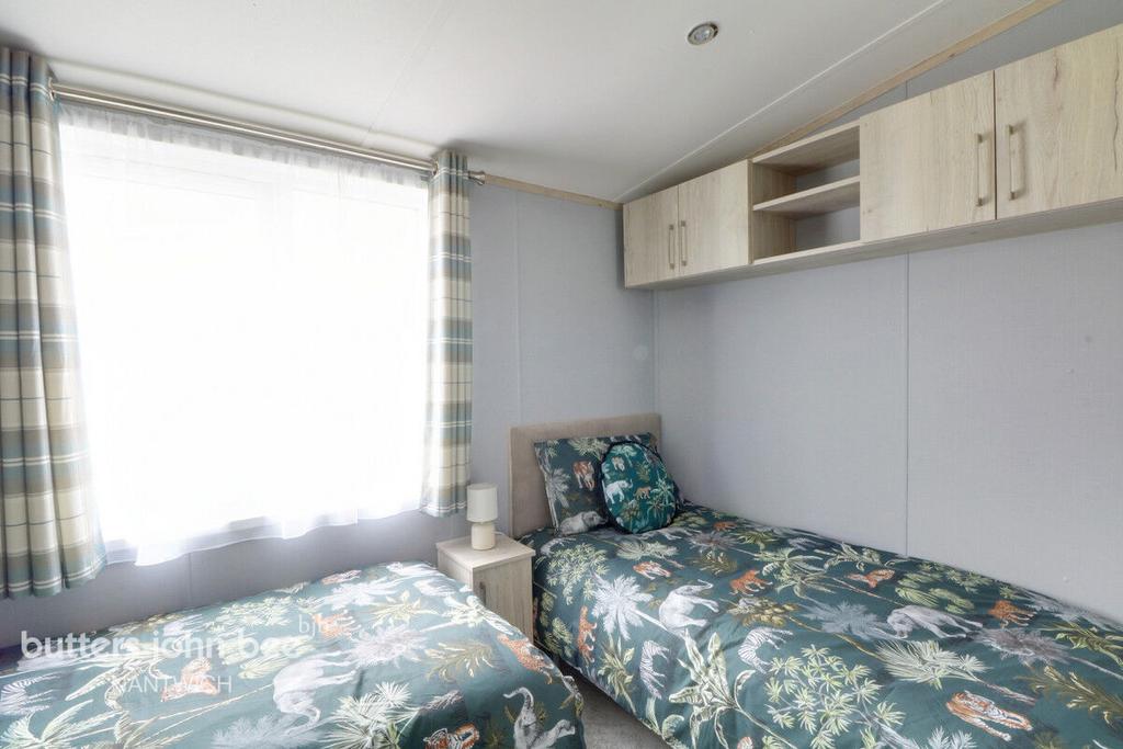 Offering two beds, fitted headboards with bedside cabinet, high level storage, fitted wardrobes, radiator and uPVC double glazed window.