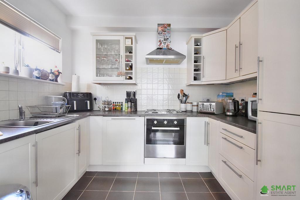 Double glazed side aspect window, wall and base units, work surfaces, stainless steel sink/drainer, electric oven, gas hob, built in fridge freezer, dish washer and washing