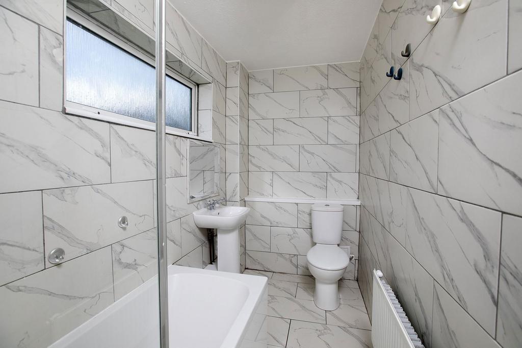 Re-fitted family bathroom with a white three piece suite to comprise of a panel enclosed bath, pedestal wash hand basin, closed coupled WC and floor to ceiling ceramic tiled splash backs.