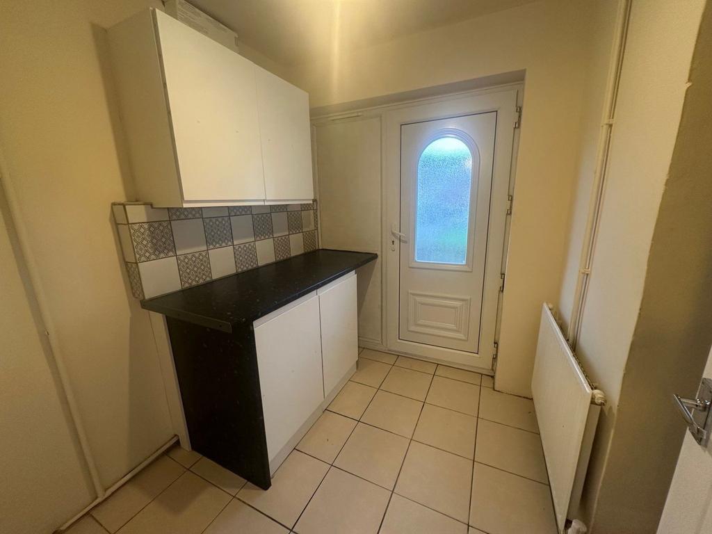 Utility room with eye and base level units, space and plumbing for a washing machine, space for a fridge/freezer and ceramic tiled splash backs.