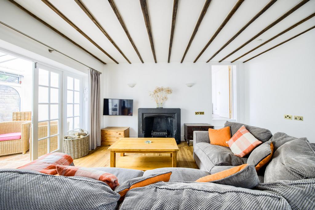 Sitting Room - A glorious room with fabulous large open fireplace with ornate surround and hearth, laminate flooring, beams to ceiling, TV aerial point, wall light points, central heating radiator and French doors through to: