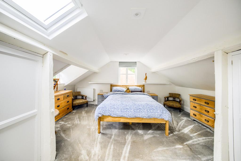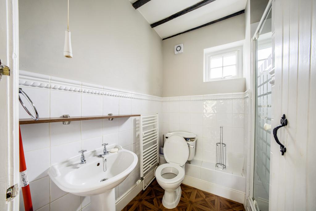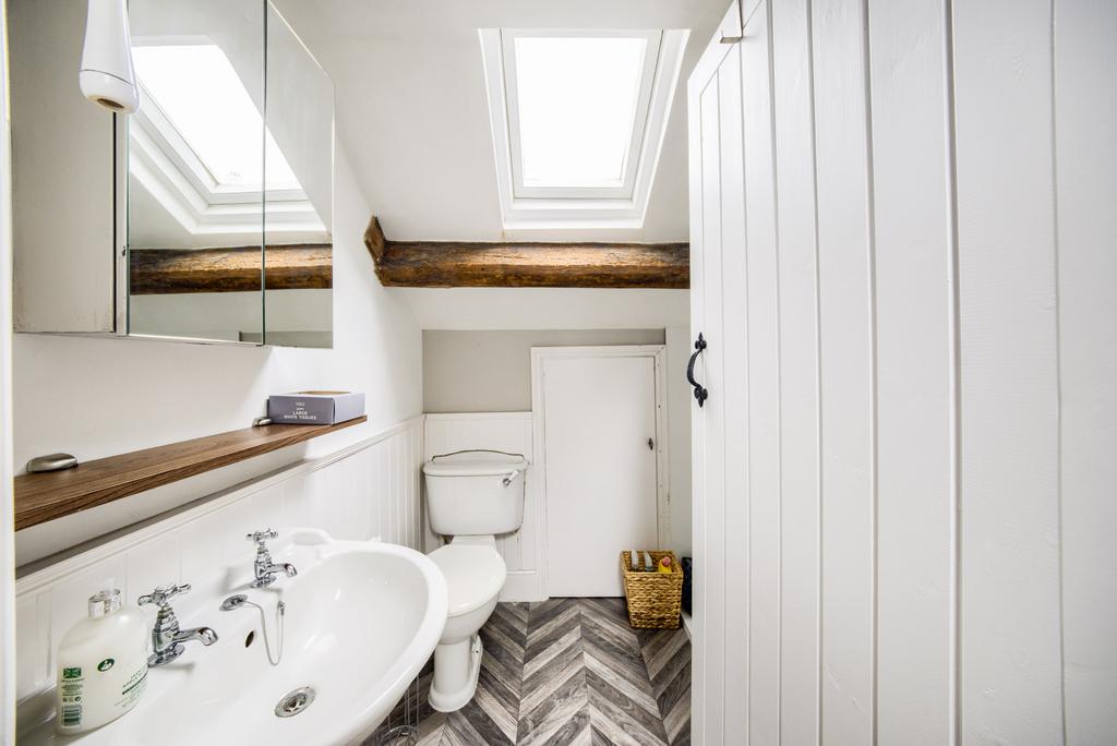 Bathroom - With walk in shower, low level WC, pedestal wash hand basin with hot and cold taps, storage cupboard in the eaves, Velux window and overhead light point.