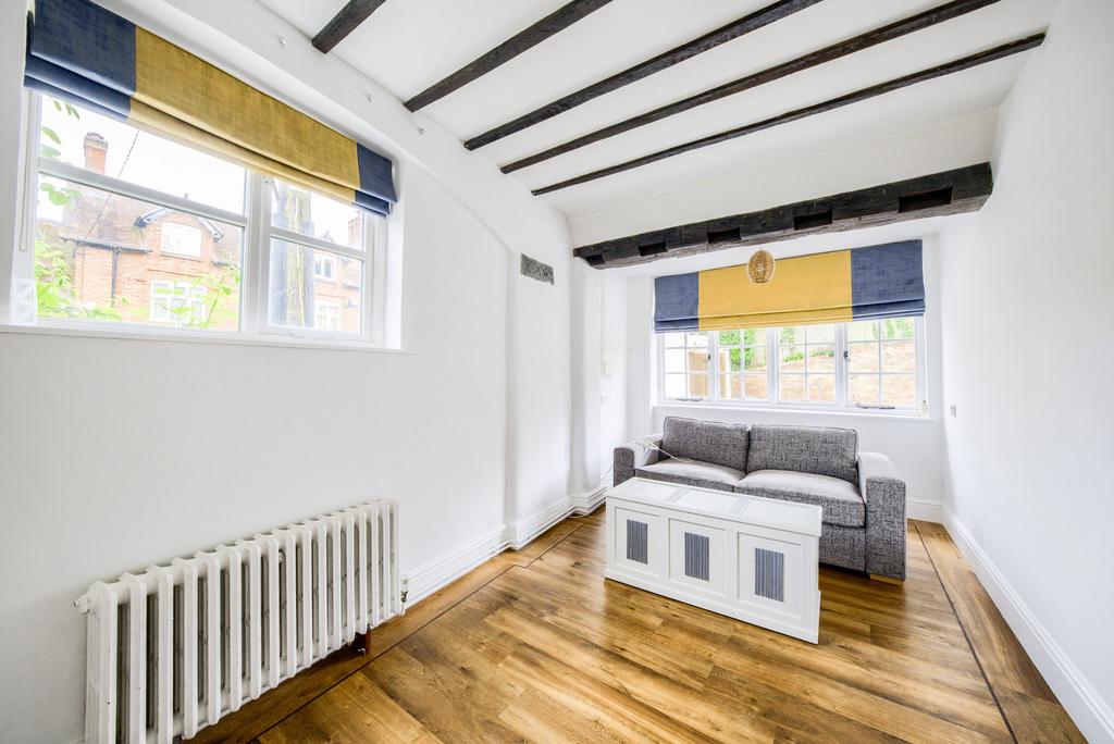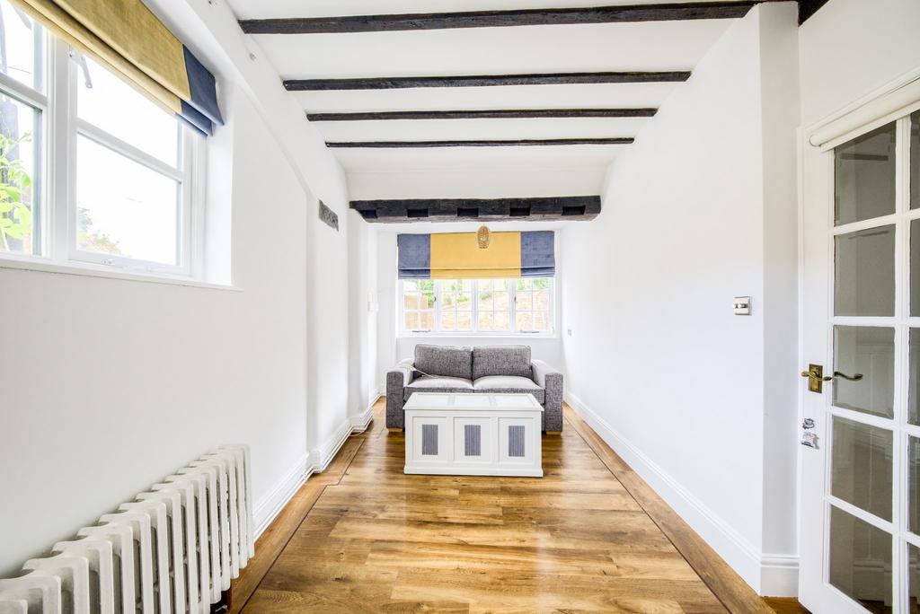 Sitting Room - A beautiful cosy room with feature open fire with surround and hearth, TV aerial point, beams to ceiling, wooden flooring with decorative border, wall light points, central heating radiator, steps up to: