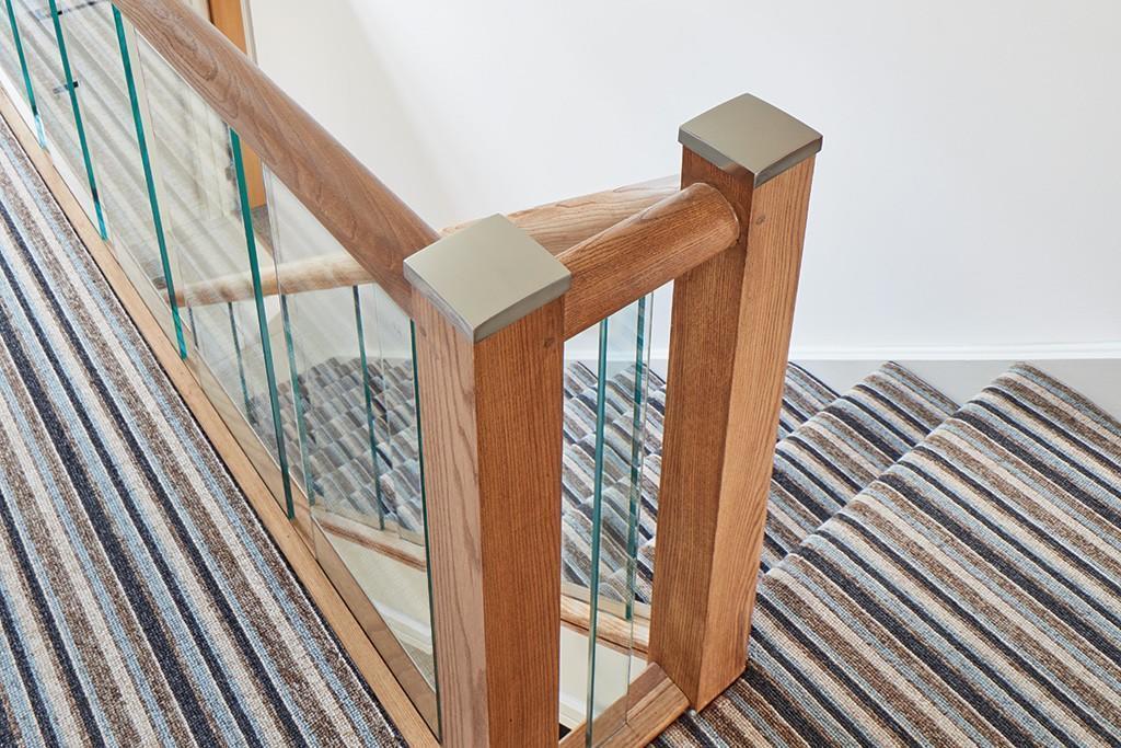 - Landing with glass balustrades, light oak stained wooden handrail and newel.