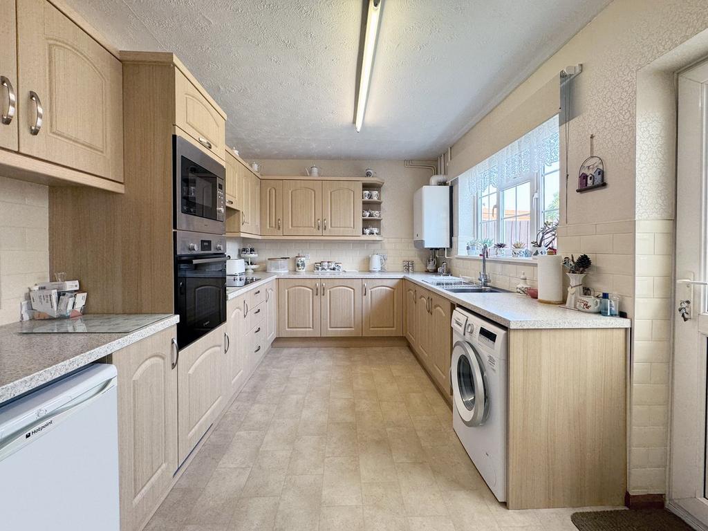 The kitchen 3.67m x 2.74m (12' 0" x 9' 0") has a window to rear overlooking the garden, and features a range of matching base and eye level units one with a built in magic corner storage to maximise space with worktops over, sink, built-in oven (installed in November 2023), built-in combi microwave oven and grill, and hob with extractor over, with space for an under counter fridge/freezer and space and plumbing for a washing machine. A door leads through to: