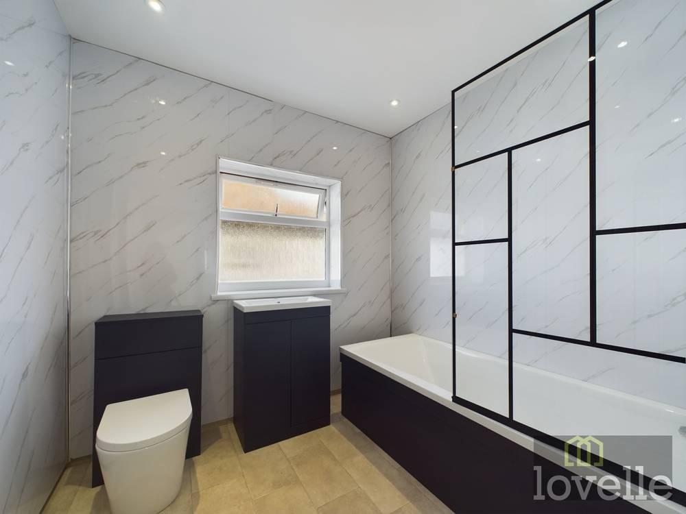 BRAND NEW. fitted with panelled bath with shower mixer taps over, contemporary shower screen, vanity wash hand basin, hidden cistern WC, full mermaid boarded walls, ceiling light and loft hatch.