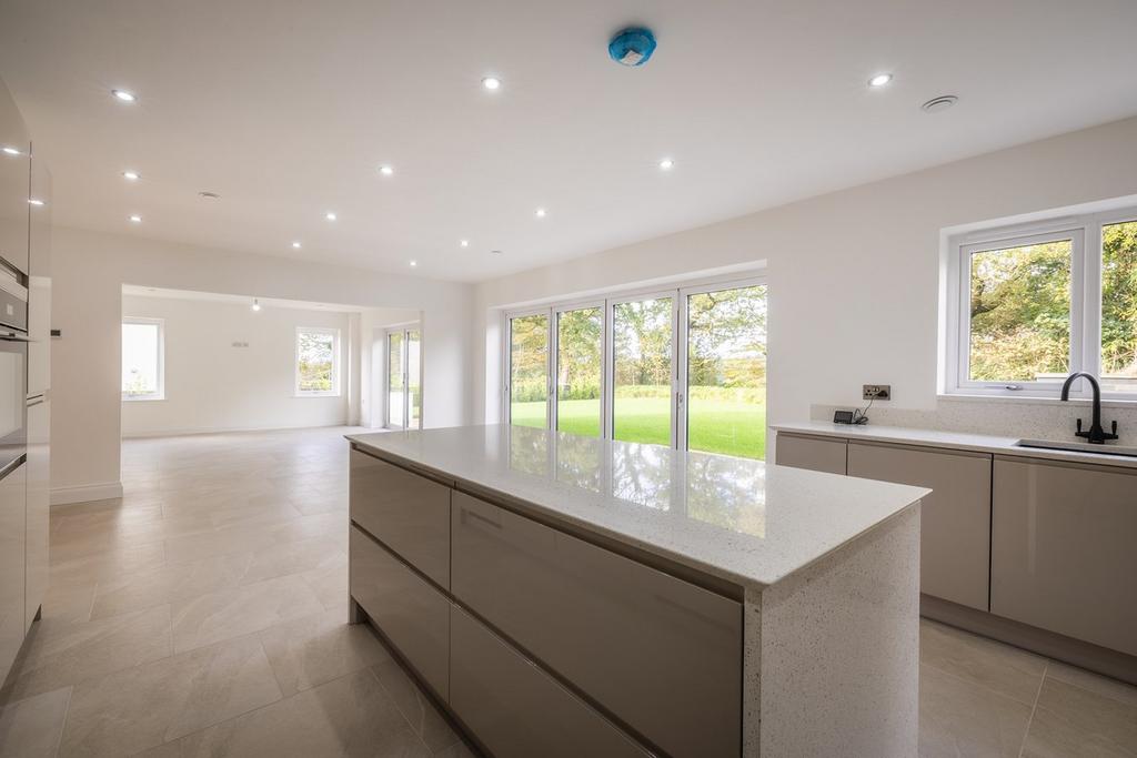 Entering the property from the spacious parking area, you arrive in an entrance porch with its handy storage room to the side. Double doors lead you into the central hallway which connects to all the principal rooms on this level. The hall is finished with beautiful oak flooring which complements the oak staircase to the first floor. Proceeding straight ahead you enter into the very generous open plan living space at the rear of the home. These two rooms, separated by a wide opening, form the perfect family space. The space offers a living area to the left hand side, dining room in the centre, and luxury kitchen to the opposite side. This open plan family space also seamlessly opens to the garden through two sets of bifold doors with even more natural light coming in from the two windows to the side.