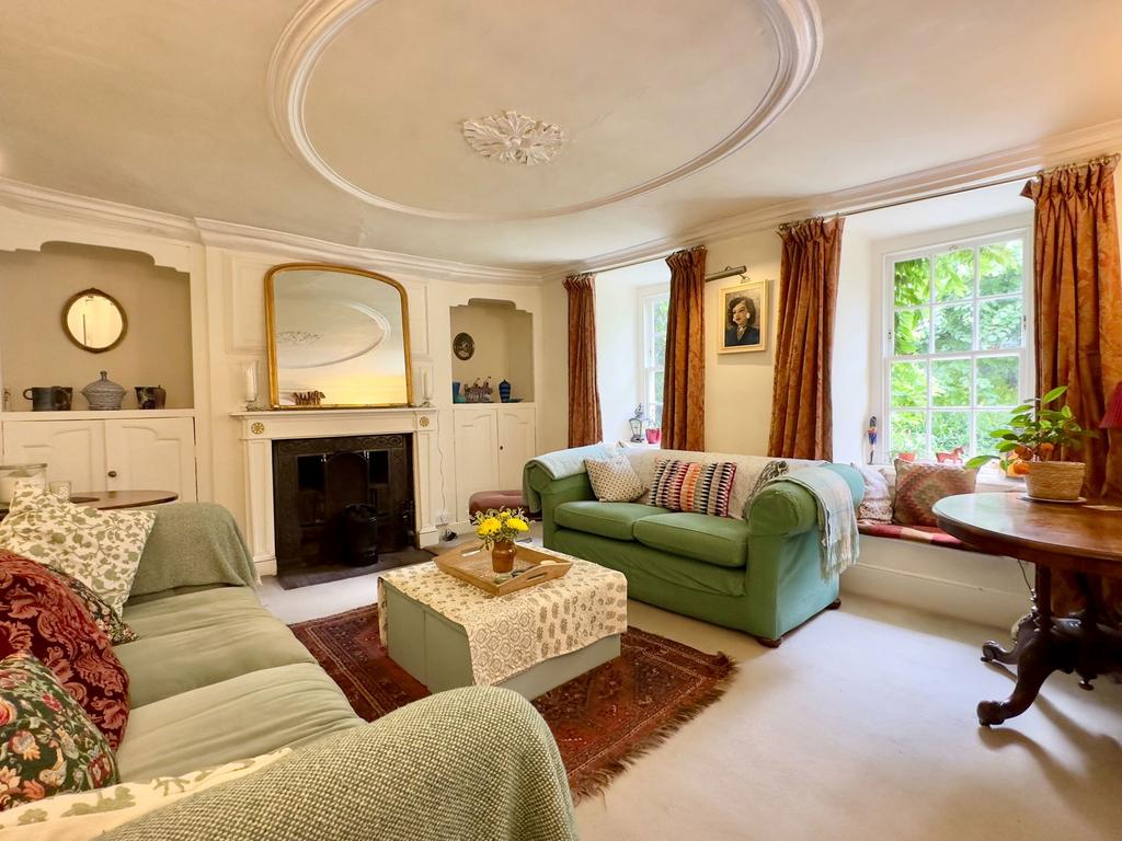 A lovely room with 2 windows overlooking the front garden again with seating, radiator, most attractive open fireplace with slate hearth and wooden surround with built-in cupboards to side, display recesses over having concealed lighting, beautiful original ceiling mouldings and cornice.