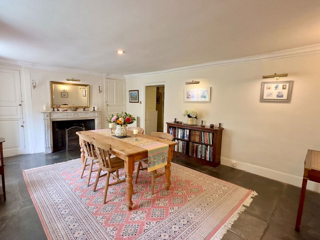 Slate floor, beamed ceiling, 4 oven dark green Aga heating the domestic hot water, French twin farmhouse sink with mixer tap over and deep drainers to side. Handmade kitchen in cherry, range of base and wall cupboards including drawers, Welsh dresser, spice cupboard, plate rack, matching moulding above the units and drawers, matching hood over Aga with carving, Corian worktops with matching cherry trim, built-in Siemens oven, Siemens ceramic hob, built-in Neff dishwasher, Siemens integral large fridge, fully glazed door to courtyard.
