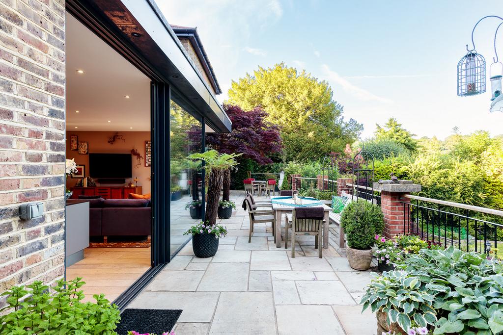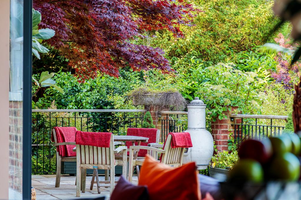 The terrace looks out to the beautiful multi-level landscaped garden below, which has mature trees providing privacy, beautiful borders and immaculate lawns.