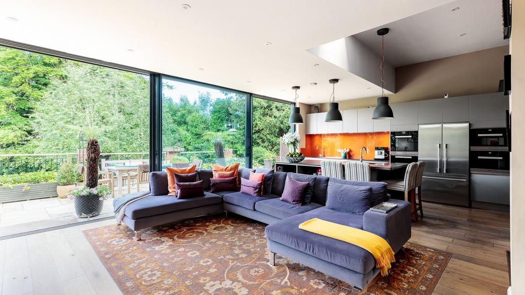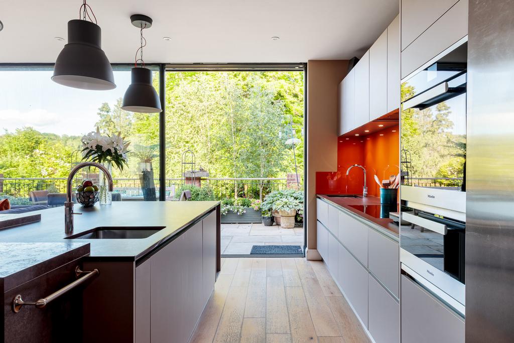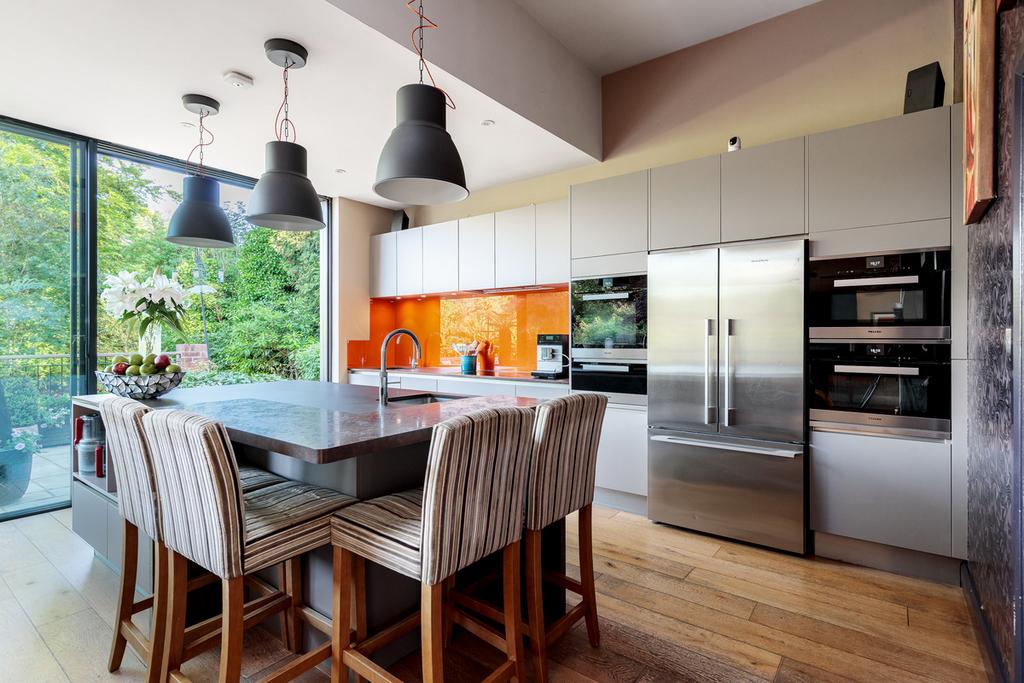 The kitchen has top-of-the-range Miele appliances, the gadget-du-jour Quooker tap and a practical Dekton worksurface on the island unit - which also has plenty of space to pull up a stool to eat or just chat.