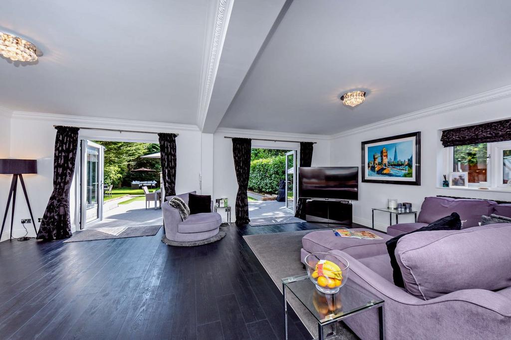 Family Room: Accessible from both the hall and the orangery kitchen, with two sets of double French doors opening to a recently landscaped patio.