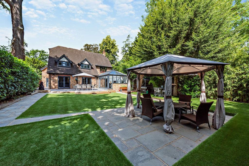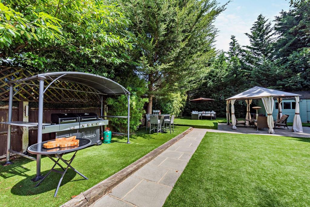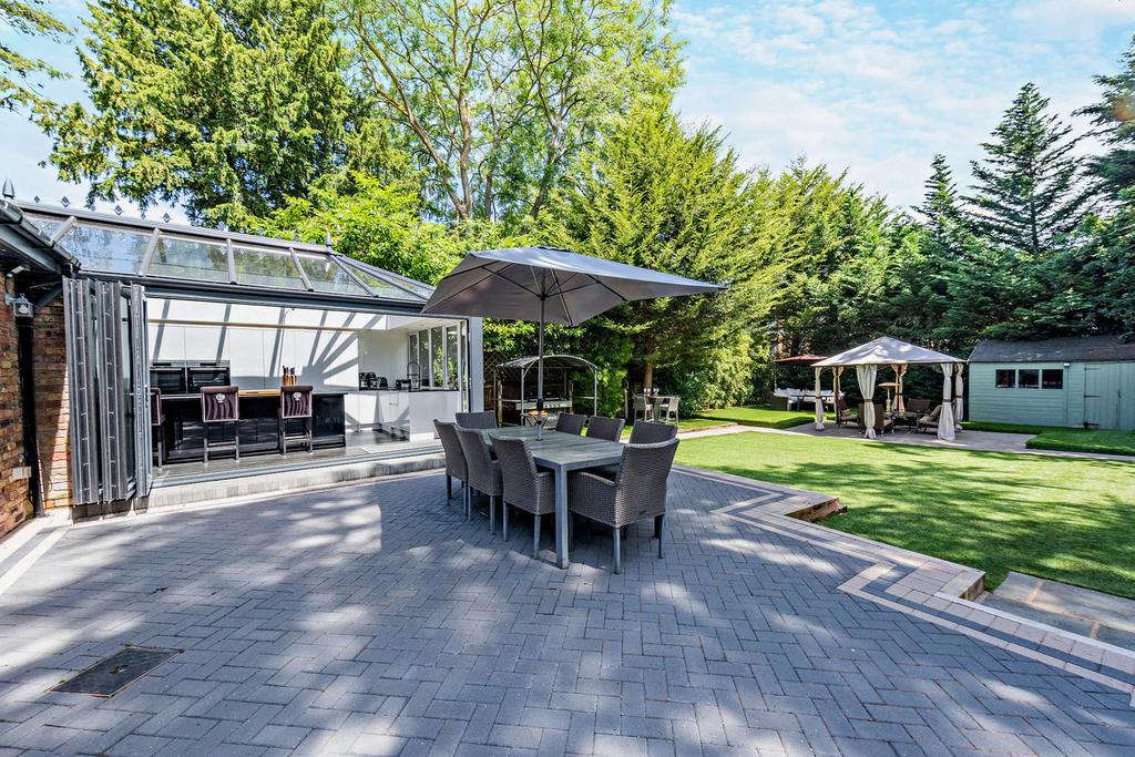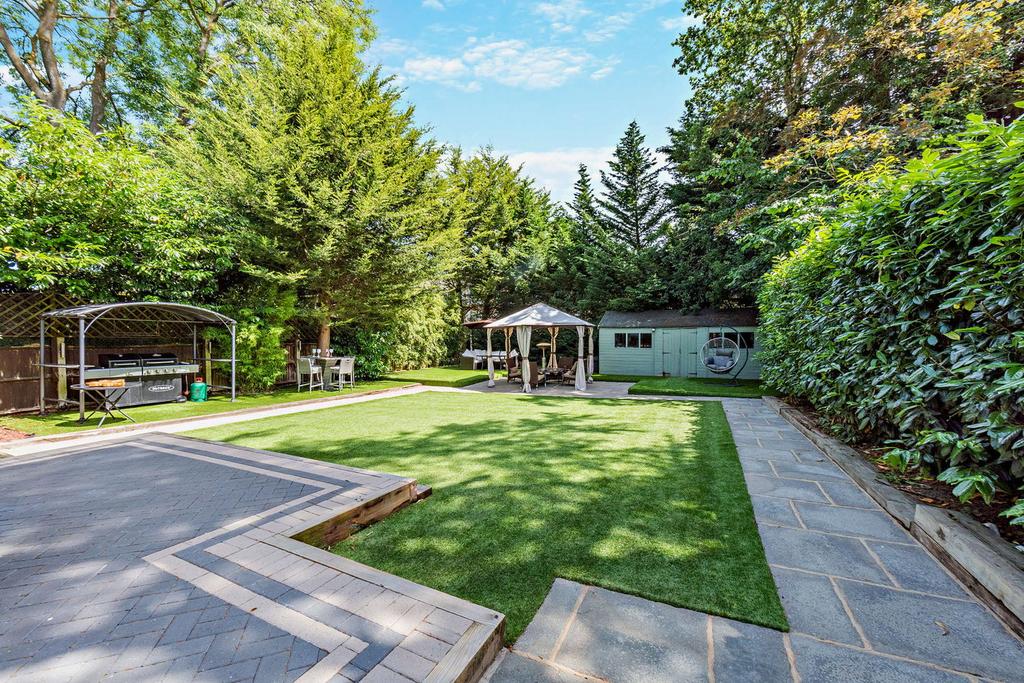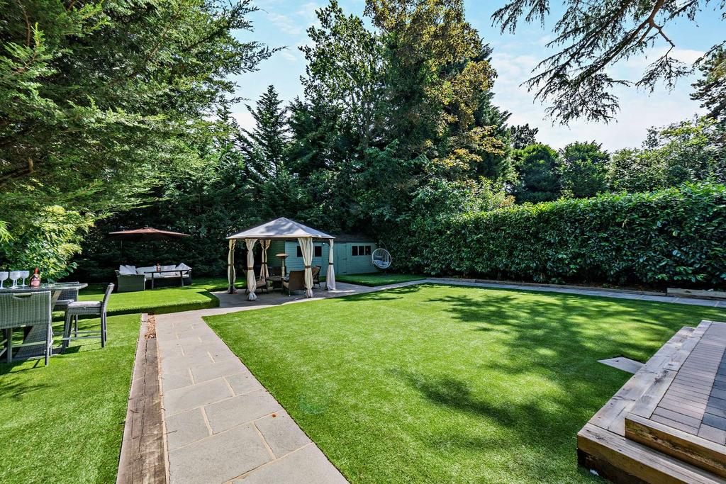 Additional features include another terrace, a large painted garden shed, and seating areas designed to follow the sun throughout the day. The garden is surrounded by mature trees and hedging, providing a private and tranquil setting.