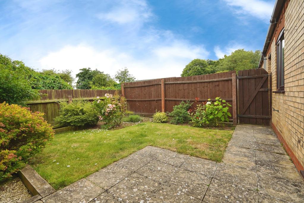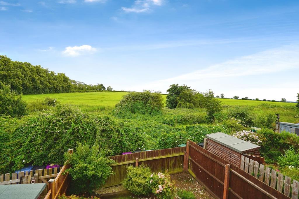 to lawn garden with shrub borders, patio area, fully enclosed by fencing and field views