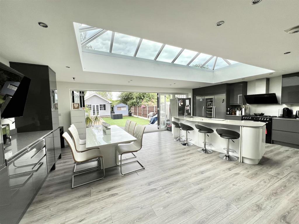 Living Room/Kitchen/Dining Room - 13.41 x 7.41 (43'11" x 24'3") - Smooth white walls and ceiling, roof lantern, grey wooden vinyl, fourteen spotlights. In the dining area there is glossy grey cabinets with plenty of space for a large dining table. Double glazed ceiling to floor sliding doors, grey and white island counter top with white cabinets. Grey glossy wall hung cabinets and white and grey counter top in the kitchen area, black gas hobs and oven and plenty of plug sockets.